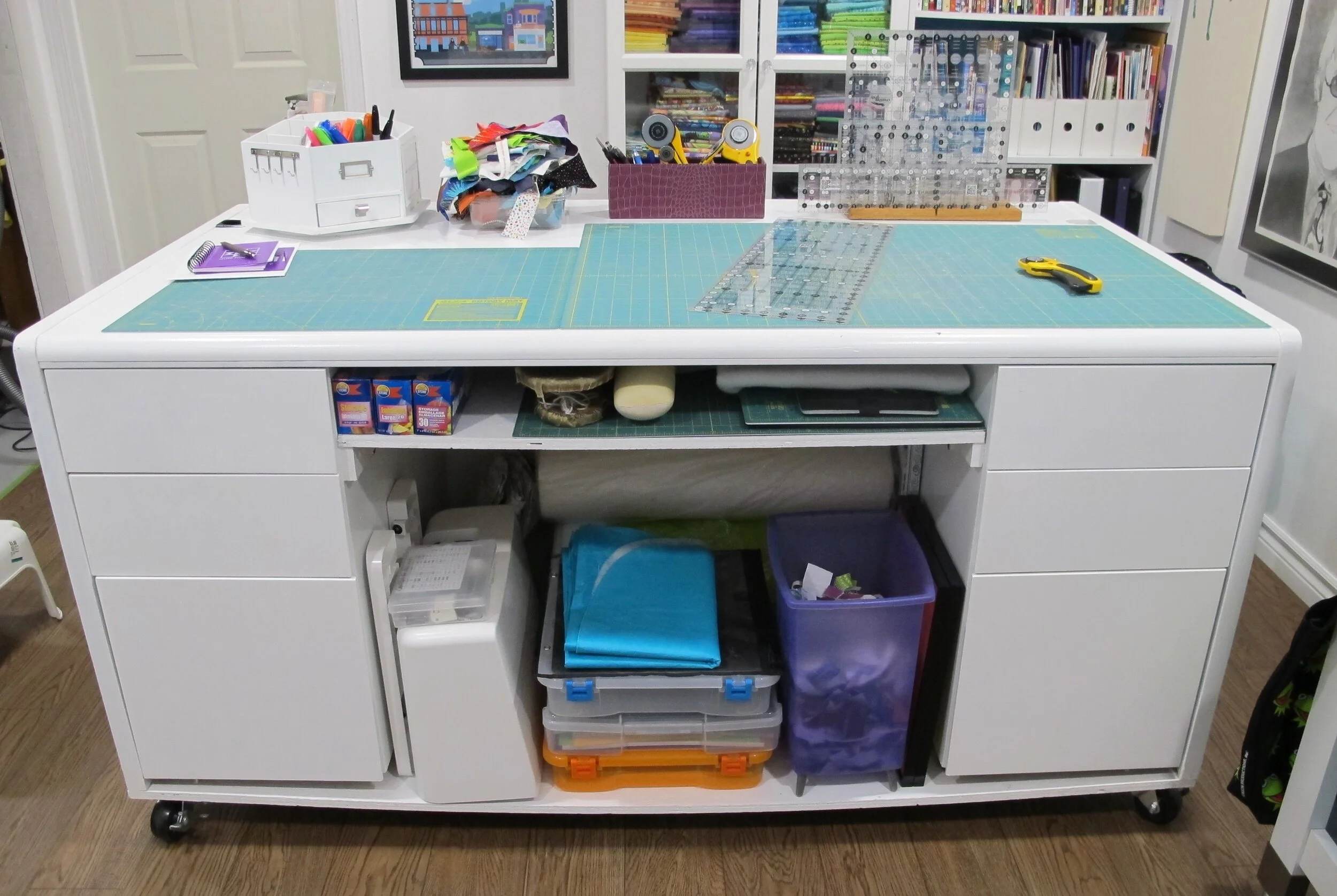 At this point I was still using my old type-writing table, another Goodwill find for $10. For you young-uns, back in the day before computers and printers we used typewriters and there were office desks configured for their use. The great thing about it was that the sewing machine sat on an adjustable shelf lower than the table top so it was very ergonomic. The problem with it was there was very little table space to the left of the machine for free-motion quilting large quilts. I needed a new sewing table.