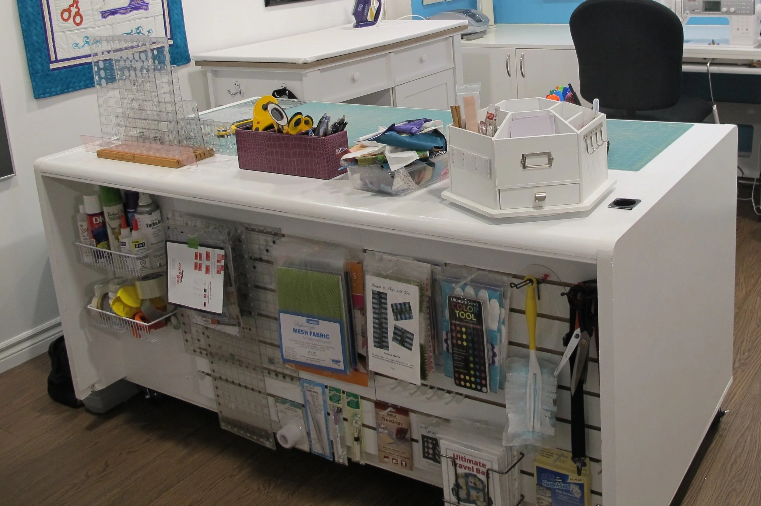 On a trip to Goodwill (so sad it’s no longer in my area) I found a massive old desk for $30 that I knew would be a perfect cutting station. I screwed a piece of plywood to the bottom to enclose the knee well for storage and added locking casters to the bottom so it could be wheeled around if needed. It's so freakin' heavy that I could have gotten away with regular casters! A shelf was added from another piece of leftover plywood and 1 x 2's for brackets. The whole thing was then painted with white melamine paint because it was old, ugly, fake woodgrain. I bought some slat board and hooks from my friend, Shirley, at Ultimate Sewing Centre, and screwed it to the inset area on the other side for hanging storage.