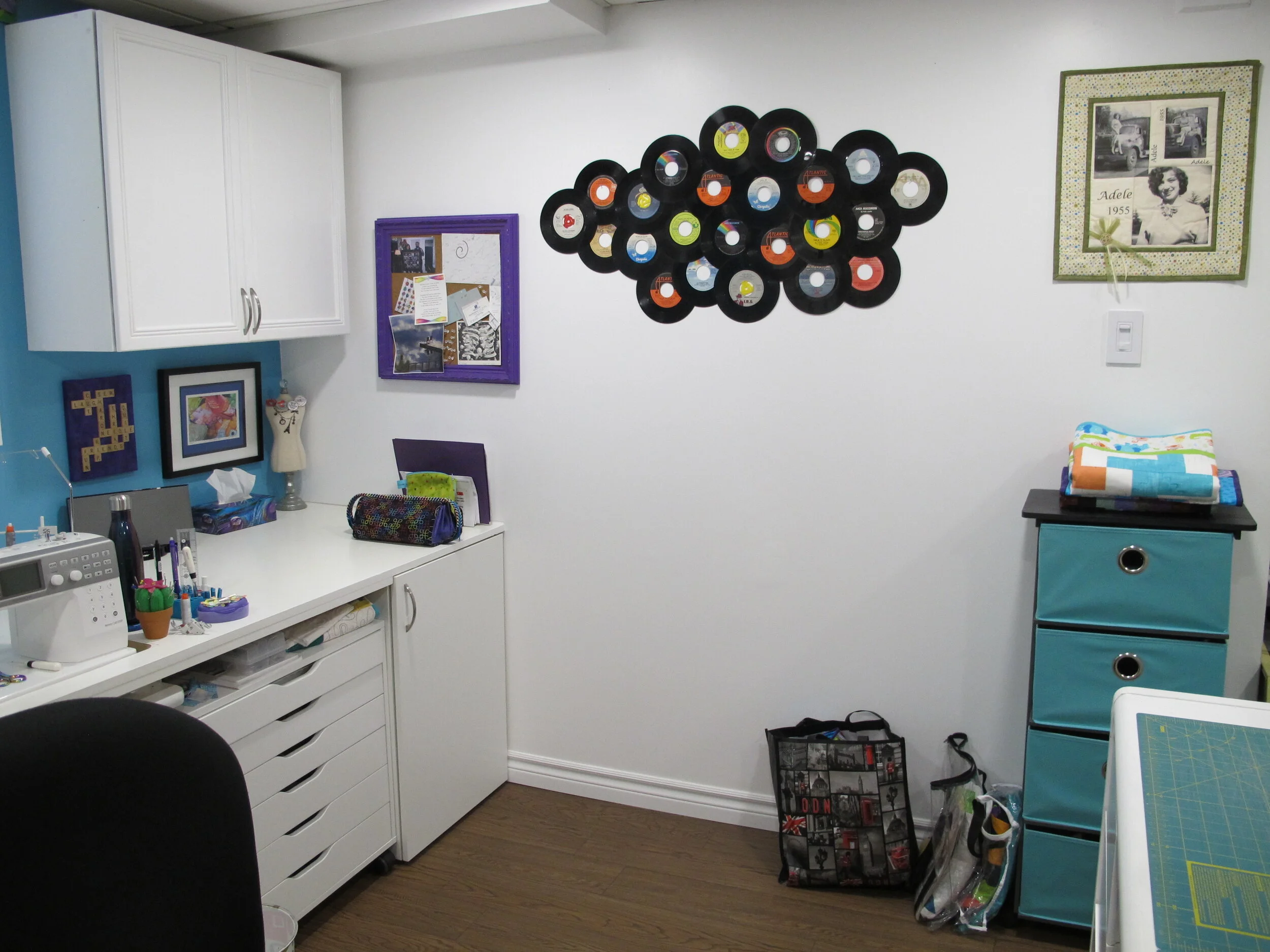 To the right of my sewing station is my design wall area. Because it's so lightweight I pull in my portable design wall (made from a sheet of styrofoam insulation covered in white flannelette) from my basement storage area when needed. The stacked drawer unit was a prize from our Elim Lodge retreat a couple of years ago (thanks Diane and Doreen!) that holds “guild stuff” in one drawer, scraps for friends in another, scraps for me in another, and one for miscellaneous stuff. The artwork that I made from 45 RPM records was some of my favourite music from the 70's and 80's (a lot of them are Elton John!).
