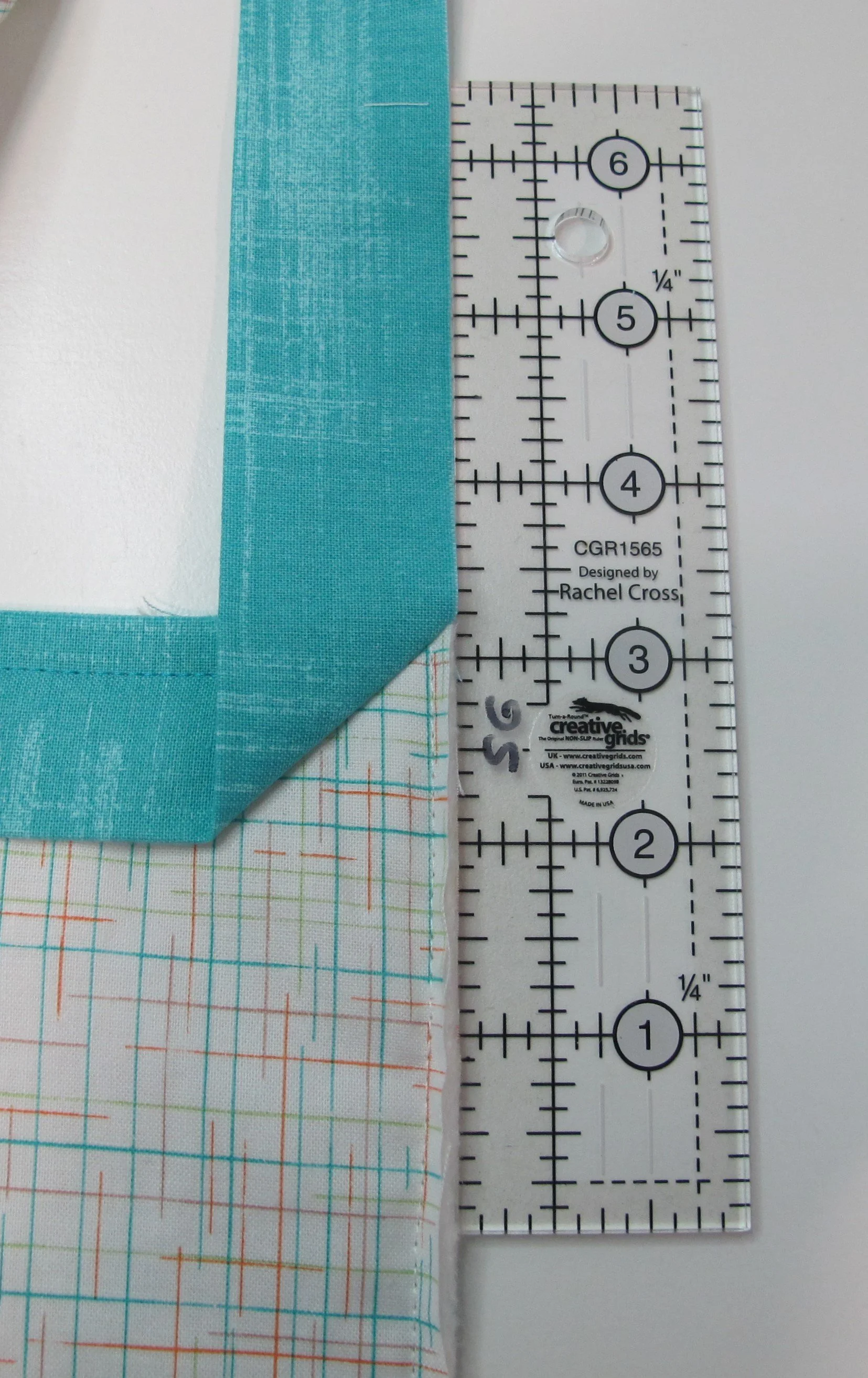 I overlap the end of the binding (on the top) over the beginning of the binding (at the bottom) by the width of the binding which in this case is 2 ½” (figure 12). Now I skooch the ruler over by ⅛” to the right (where the awl is pointing), draw the line on the fabric on the left side of the ruler (where the marker is pointing) and cut the extra off (figure 13). *** No matter what size binding you prefer, remember to overlap by the width of the binding minus ⅛”. Moving the ruler by just that ⅛” takes away ¼” of fabric so the binding snugs up against the edge of the quilt...and no wavy binding.