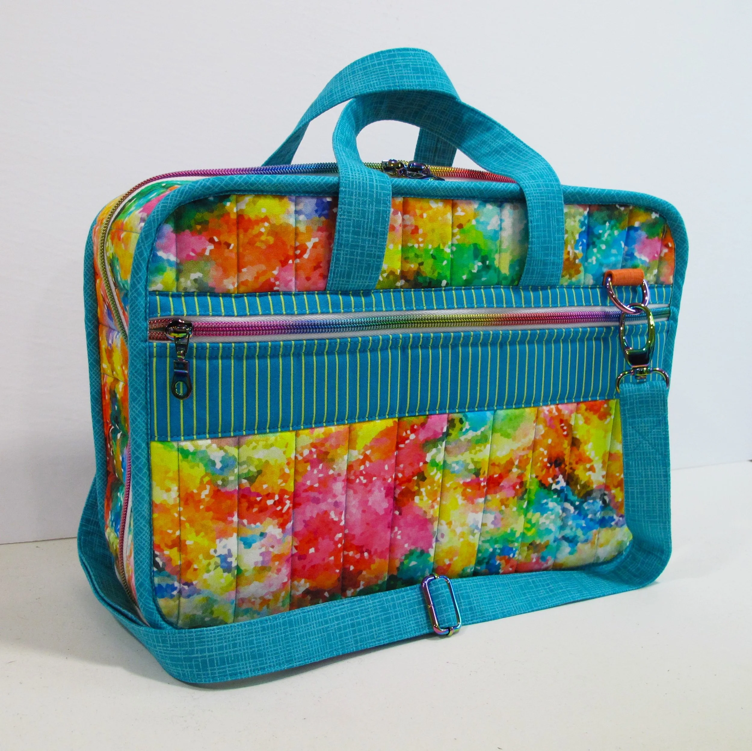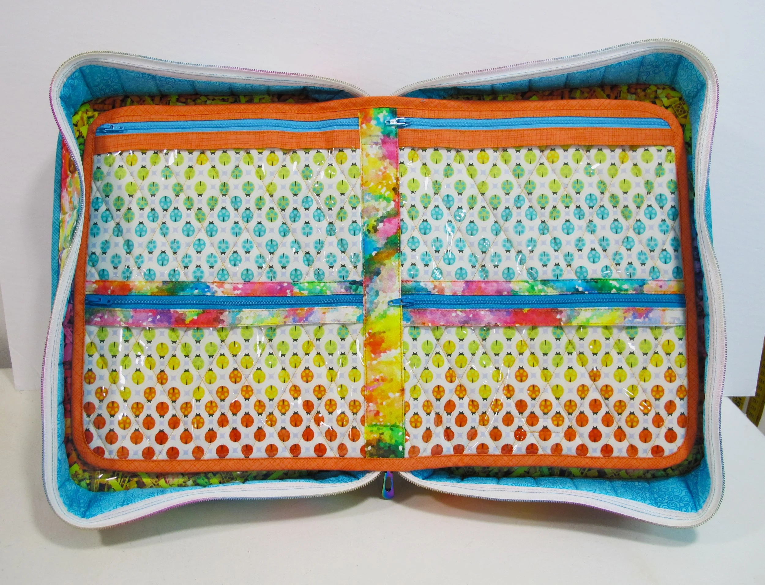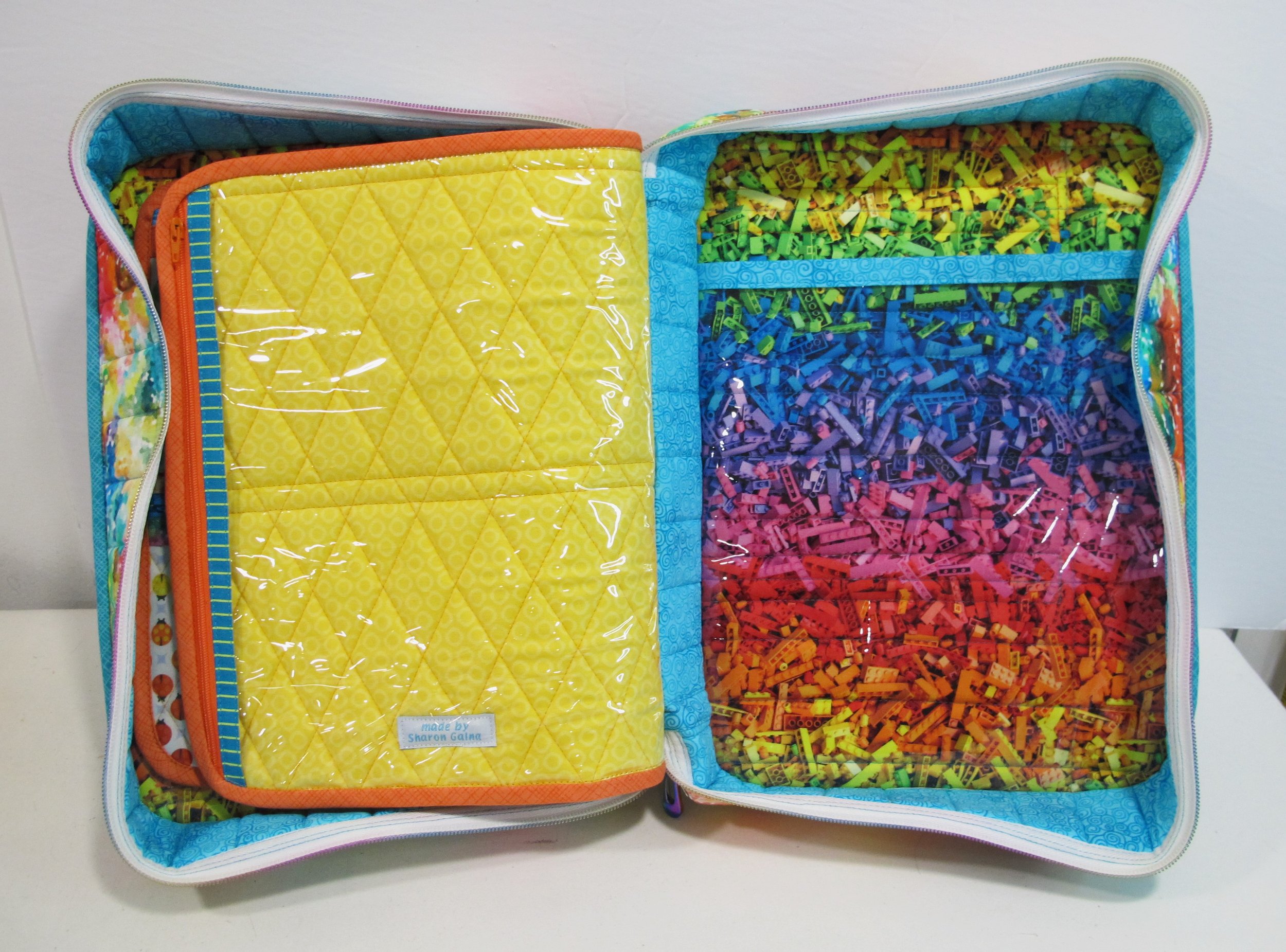 The fabrics she chose (the main outer fabric, Tula Pink’s ladybugs and a Lego print) are awesome and luckily they all coordinated really well. Other assorted bright fabrics for the pocket areas and accent strips finished it off beautifully. Again, all the rainbow hardware was purchased from Emmaline Bags and the awesome rainbow zipper was from Zipper Valley. I only made one large inner “page” pocket for the bag because I thought the centre area would be able to hold a plastic container for Kate’s embroidery floss. The day after she received it she sent me photos of it already filled with her supplies…I think it was a hit.