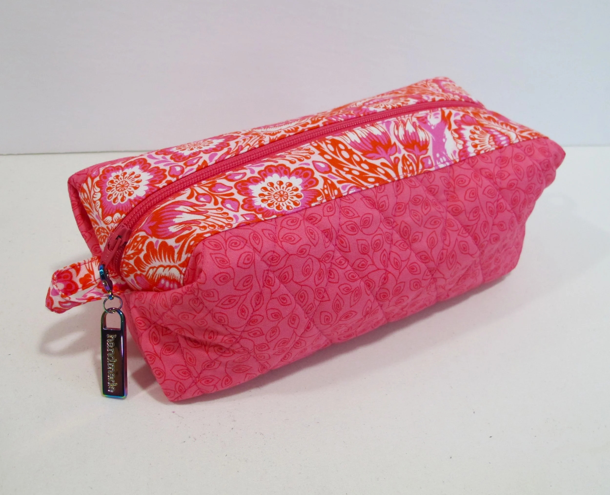 Alex’s girlfriend, Lindsay, loves pink so I made her this super cute “scrappy sewing pod” from the book Lot’s of Scraps It’s Time to Quilt that was also great for hiding a Winner’s gift card. In my stash I was able to find a sweet Tula Pink print, a coordinating leaf print to go with it, and finished it off with a “handmade” zipper pull that I purchased from Emmaline Bags.