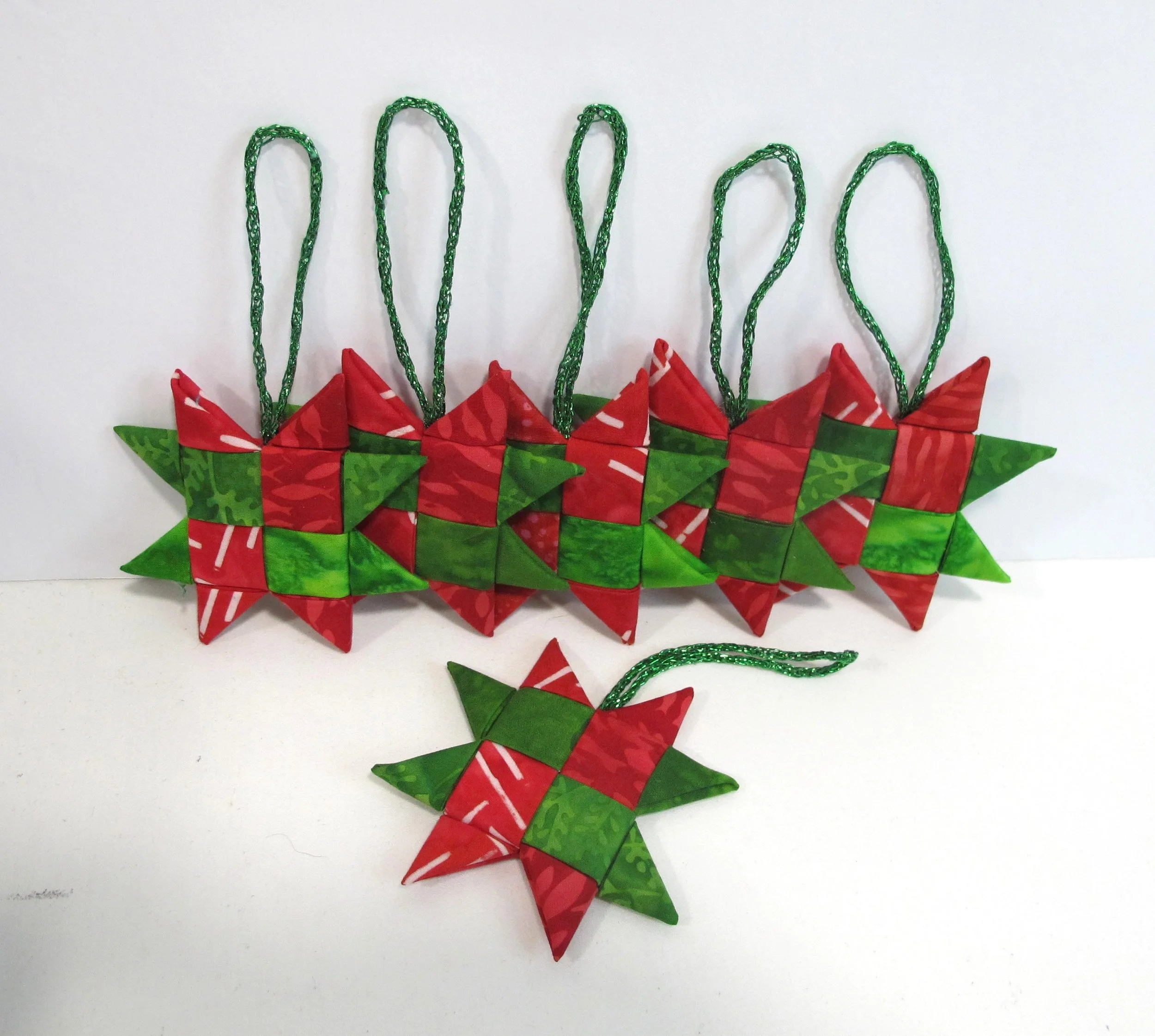 It was so much fun making the Scandinavian woven stars last year that I knew I wanted to make more this year. This time I went with the traditional Christmas colour scheme of red and green. Our next door neighbours, who fed us tomatoes from their garden all summer, got a set, and so did Nick’s parents, Lina and Angelo. One set had darker green batiks while the other had lighter green batiks and they look very different from each other even though the reds are the same. If you plan on making some yourself, batiks work really well for this project because they hold the crease so well.