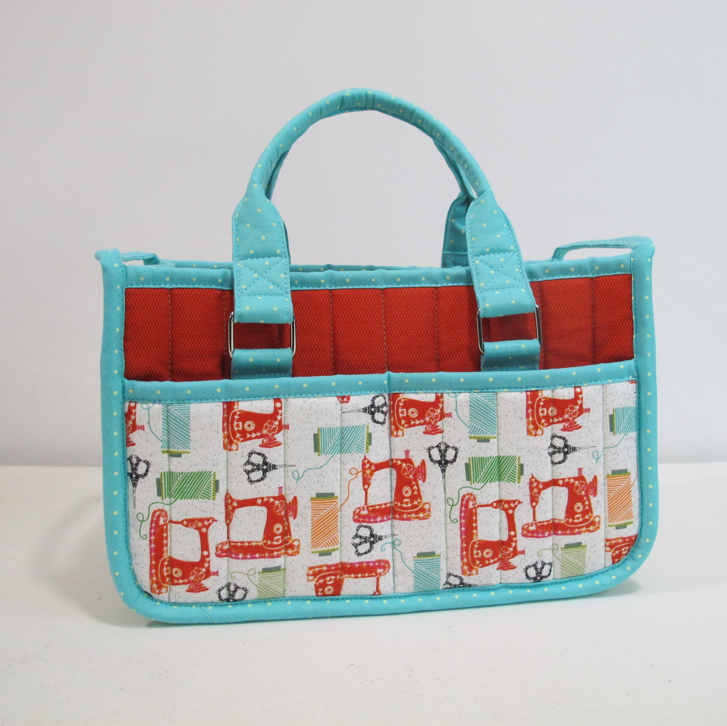 Now that the Christmas season is in the rear view mirror I can finally share with you the presents I made for my loved ones. You already saw the In Control bags that I made for my quilt buds…well, Trudie got one too. This time it was made with a couple of great sewing themed fabrics that I had in my stash. I had a great time customizing these bags for my friends and, of course, it barely made a dent in my stash! Also, I had all kinds of off-cuts and scraps of one sided fusible foam leftover from other projects that were the perfect size for this smaller bag, so I was able to use them up too.
