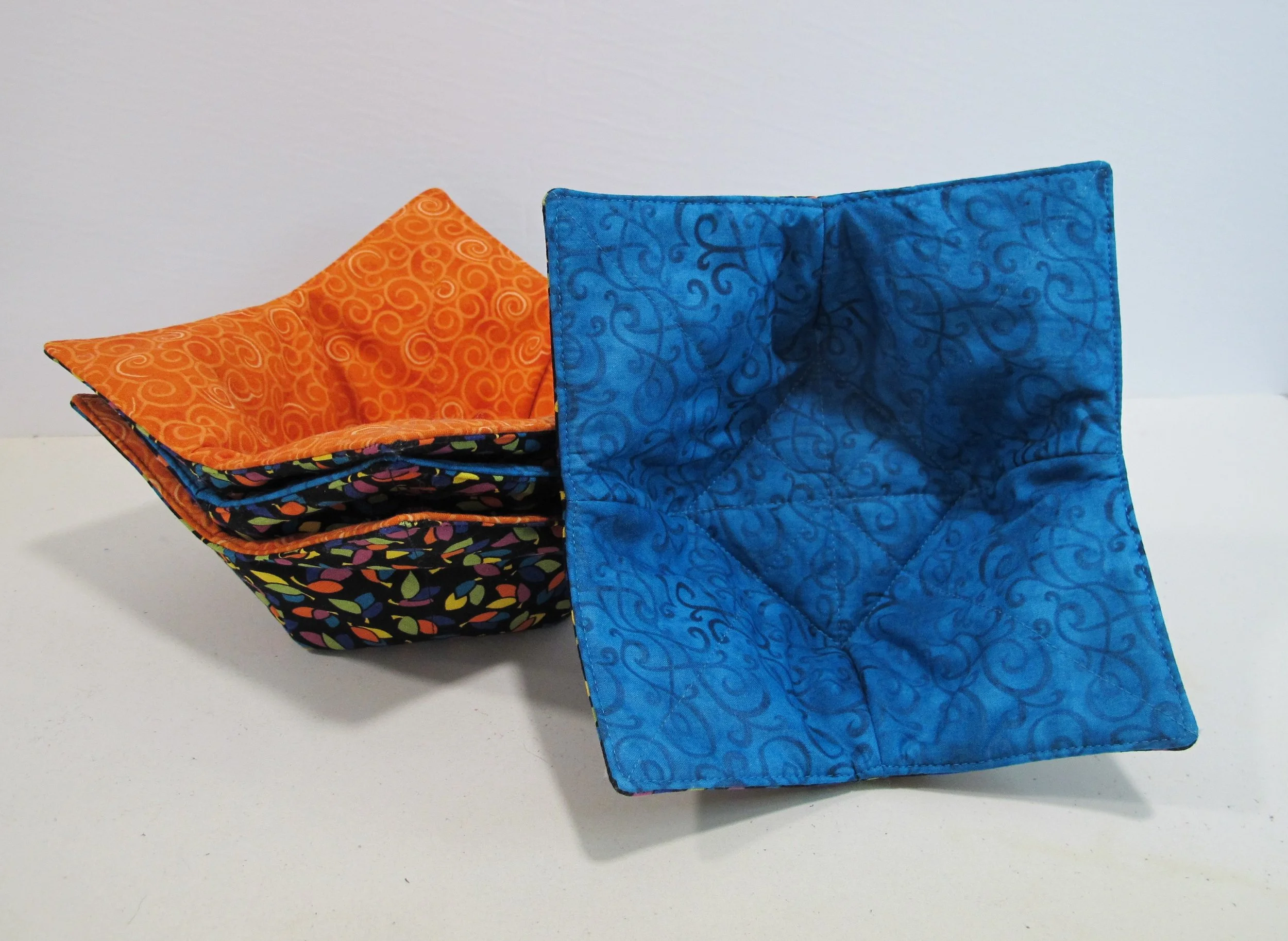 My neighbour, Aneita, got a set of bowl cozies for heating up soup/chili in the microwave so she wouldn’t burn her hands. They are super quick to make and use up small amounts of fabric and Wrap’n’Zap (the batting material that’s safe to put in the microwave). If you want to make some yourself, all you need to do is do an online search for “bowl cozy” and lots of tutorials will pop up. You will notice that I stitched down a square in the centre of the cozy, in line with the darts…I have some of these myself and found that when laundered they really went out of shape so hopefully this will prevent that from happening. *** It is imperative that all supplies, including thread, are 100% cotton. Polyester (and other man-made fibres) will melt in the microwave and become hard and crusty.
