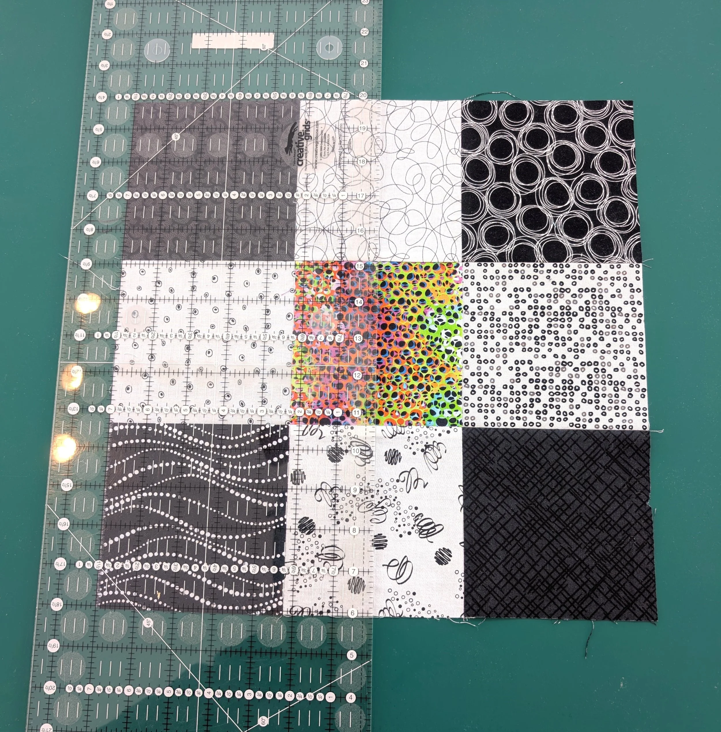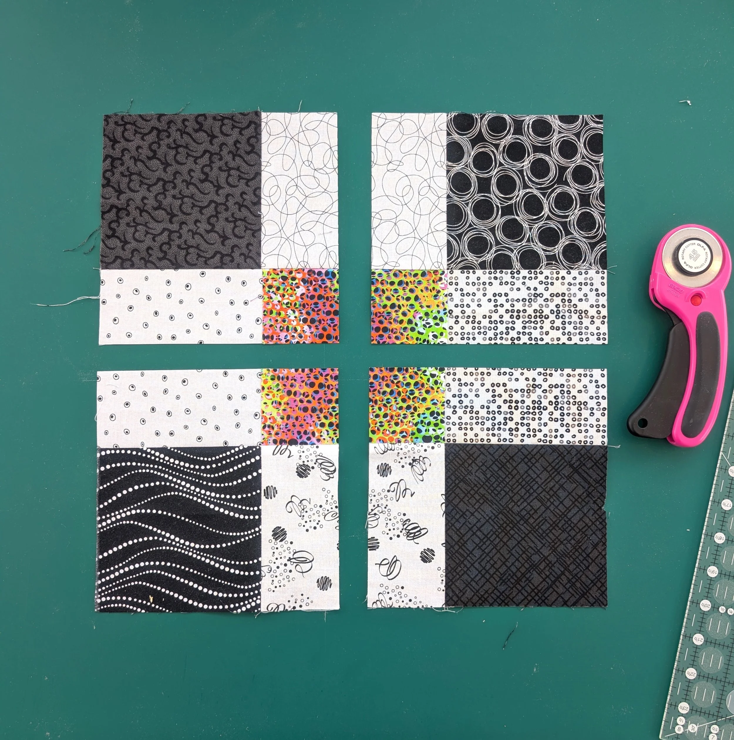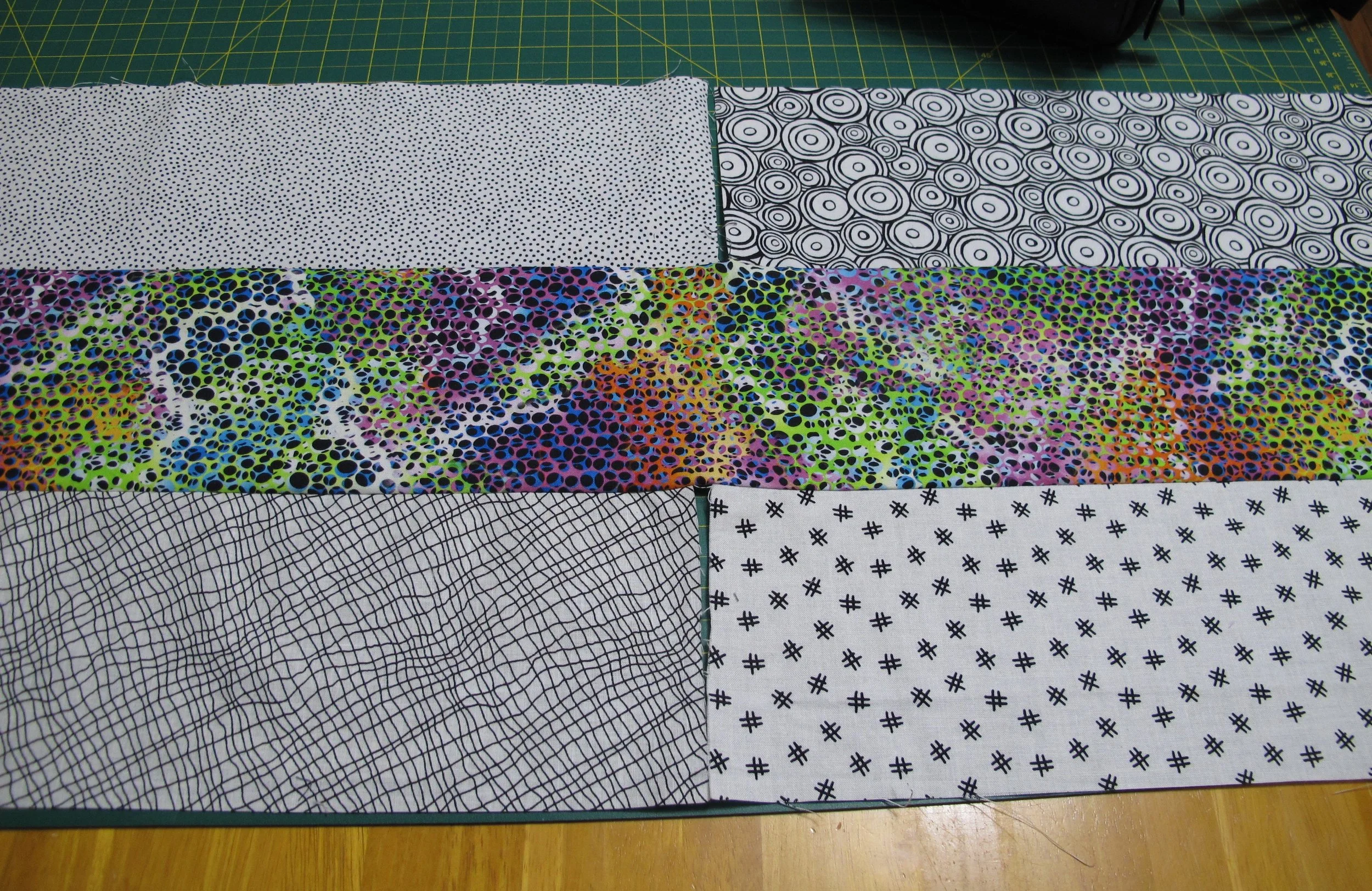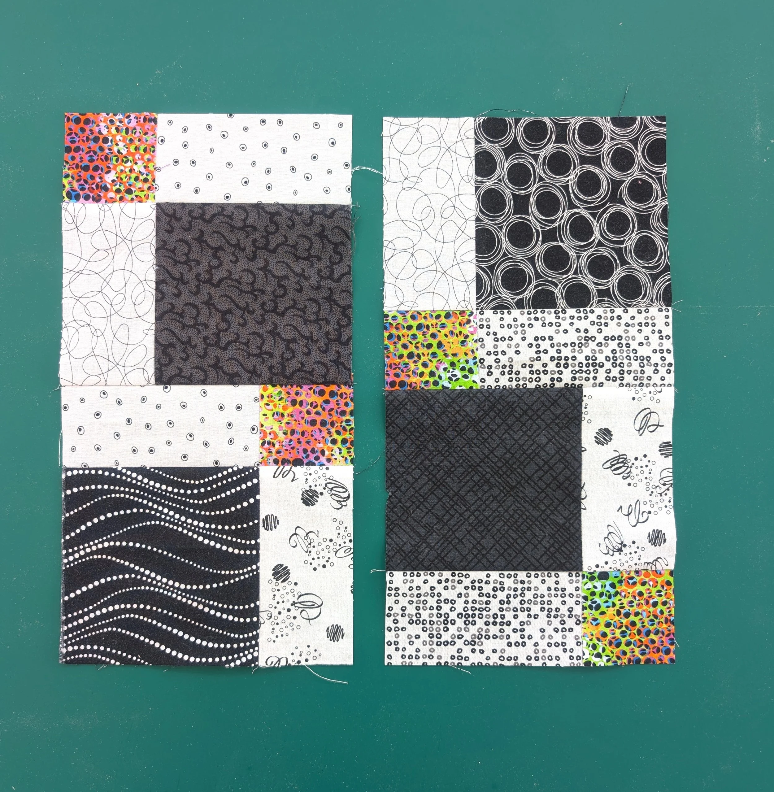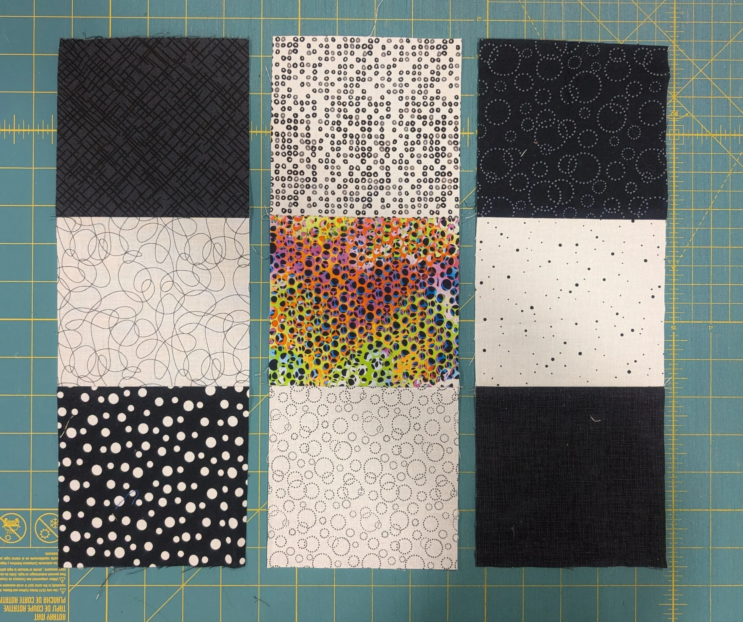 Below, even though I have used a variety of fabrics for each strip set, the black print fabrics are considered Main #1 and Main #2, the white print fabrics are all considered as Coordinate #1, and the colourful print is Coordinate #2. Each of these strip sets are cut into 5” segments that are then stitched together into 9 patch units.