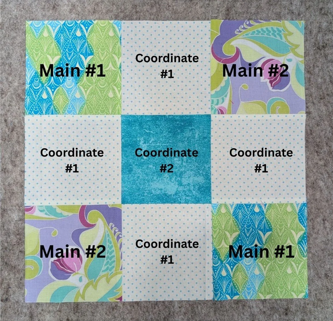 Set 1: stitch Main print #1, Main print #2, and Coordinate #1 together, with Coordinate #1 in between Main #1 and Main #2