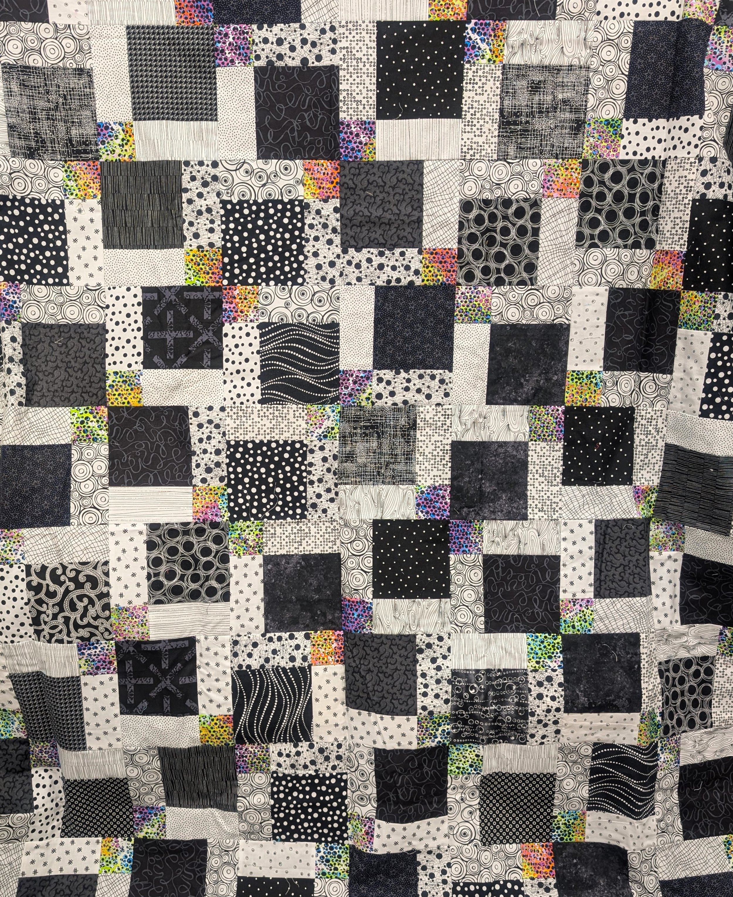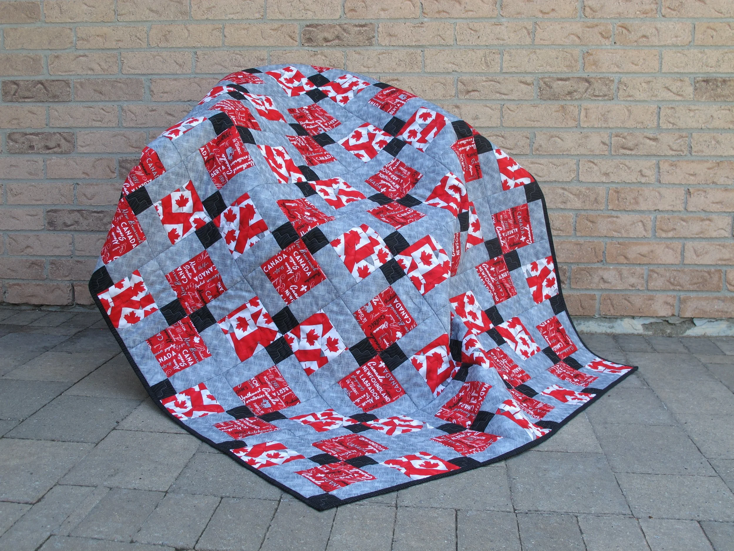 Instructions are for a lap sized DNP quilt (52” x 65”) with 13” finished blocks. There are 4 blocks across and 5 down for a total of 20 blocks. I have shown 2 examples (and one single block to show fabric placement)…the Canada Day quilt has the same four fabrics used throughout the entire quilt, and with the second example I have gone through my scrap bins and used a mix of black with white and white with black fabrics with one colourful print for the centre square.