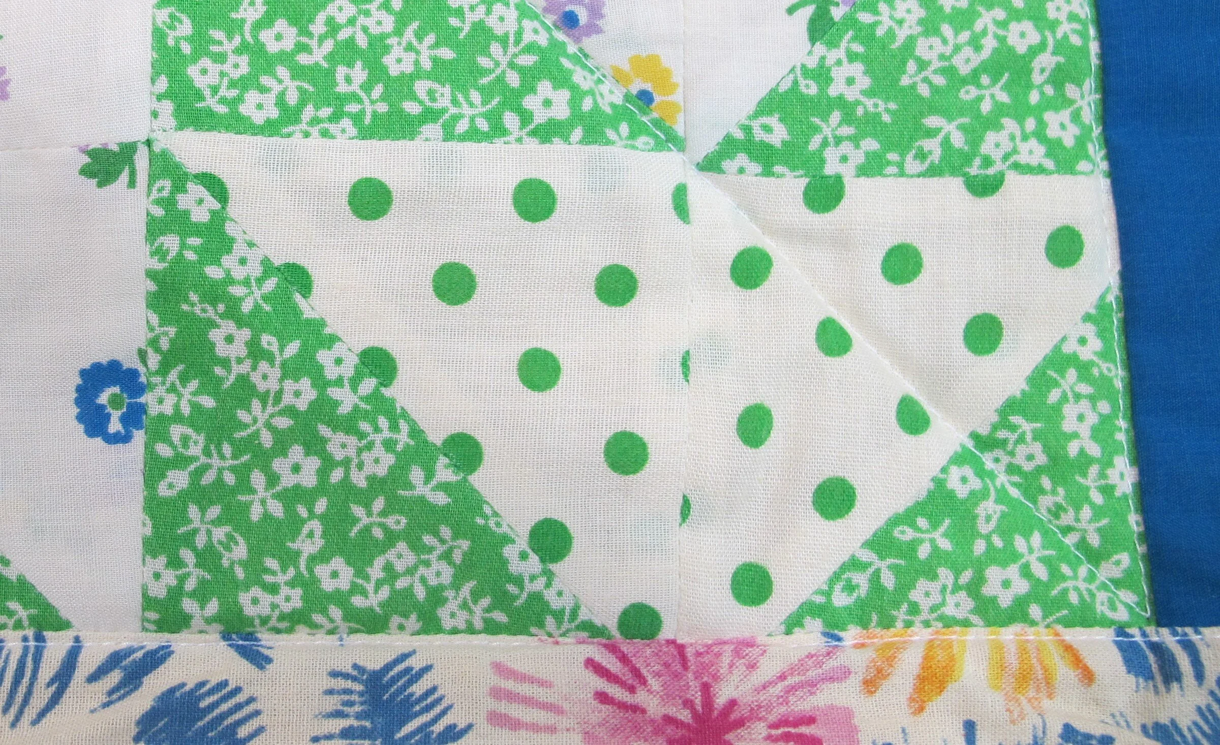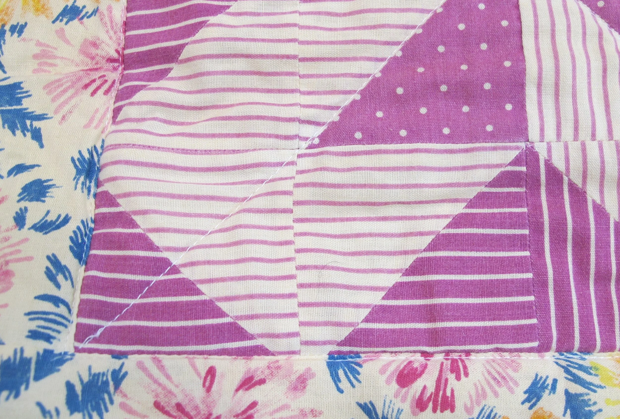 Remember my post about beginners wanting to be perfect right out of the gate? Get over it...that takes time and practice. Again, so what if your seams don't match and your points are cut off? We aren't looking for perfection, we're looking for growth. And with that comes a little bit of trepidation for things we've rarely done before. Below you will see close-ups of a couple of my very first quilt blocks...points are cut off (really cut off!!!) and seams don’t match…not very pretty are they?!