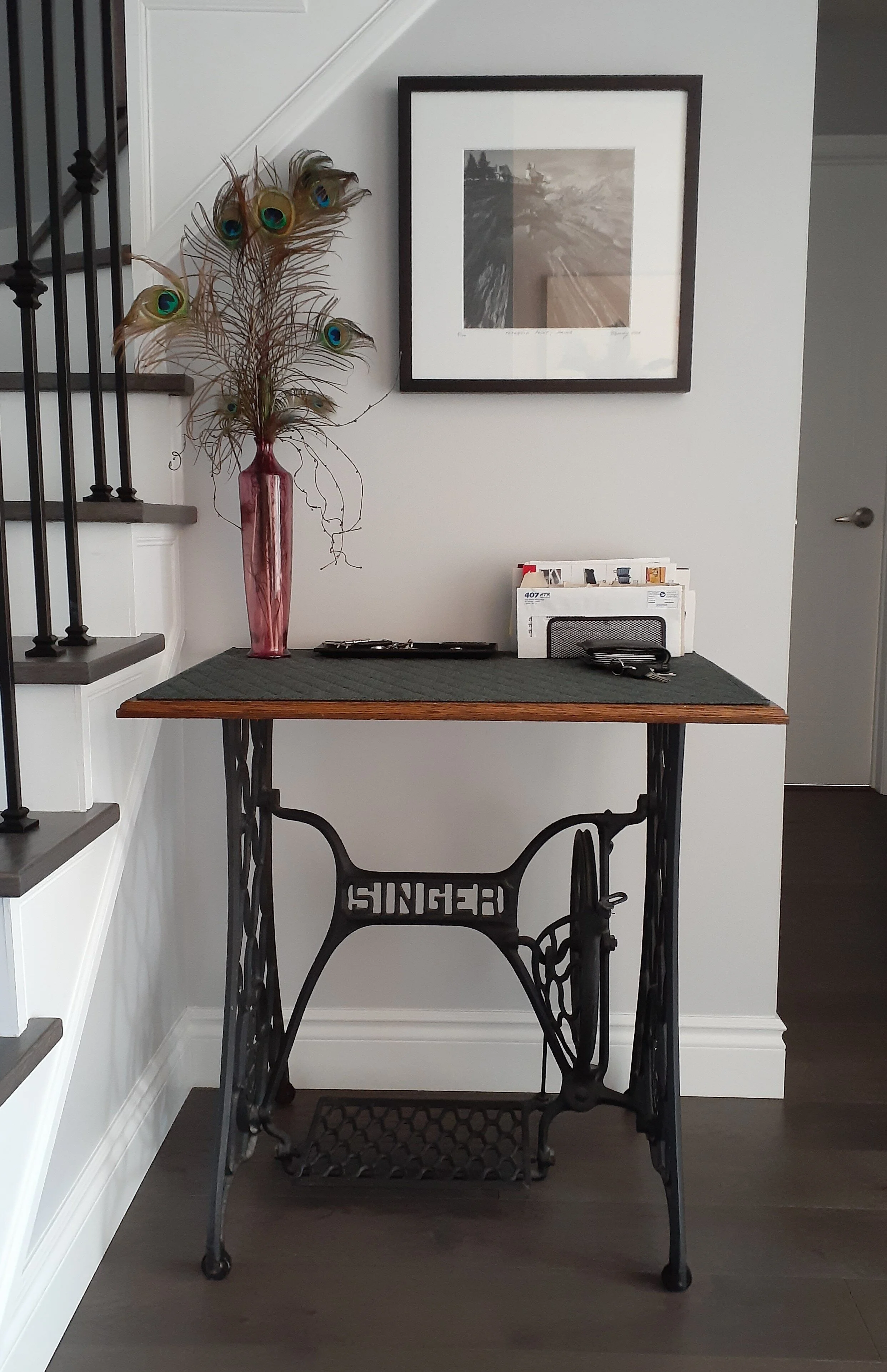 Another yard sale find was in Eastern Ontario while we were at the cottage. A Singer treadle machine base was peeking out from under a pile of junk. I paid about $40 for it (which was quite a bit of money in garage sale terms circa 1996), but I had to have it. I knew that with a beautiful wood top it would make a great hall table so I had a friend make the top out of oak. Kate and Alex did a great job cleaning up the base in preparation for paint (get a load of their looks of concentration!).