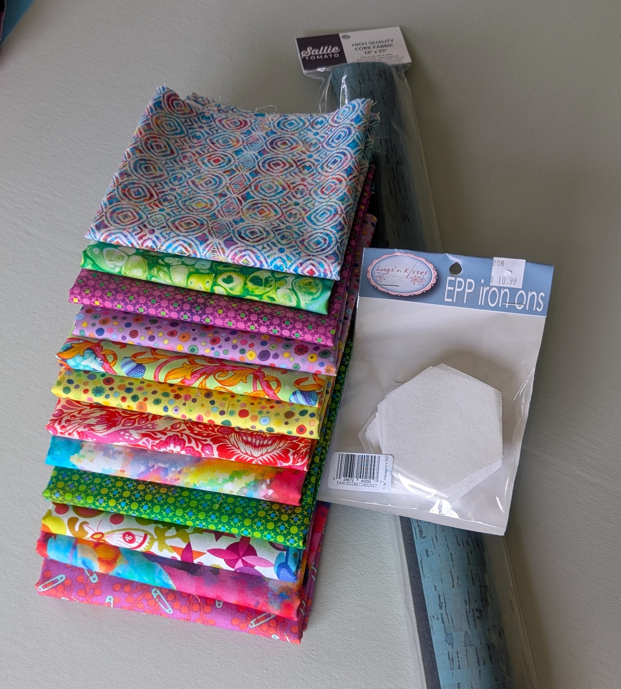 The other project I was able to cut out and get ready is a half hexagon quilt using the Deco Glo fat quarter bundle that I bought last summer. I’m pairing them with Tula Pink’s Northern Lights fabric. With the leftover scraps I was also able to cut out some hexagons for my English paper piecing. Not one bit of this gorgeous group of fabrics is going to waste!