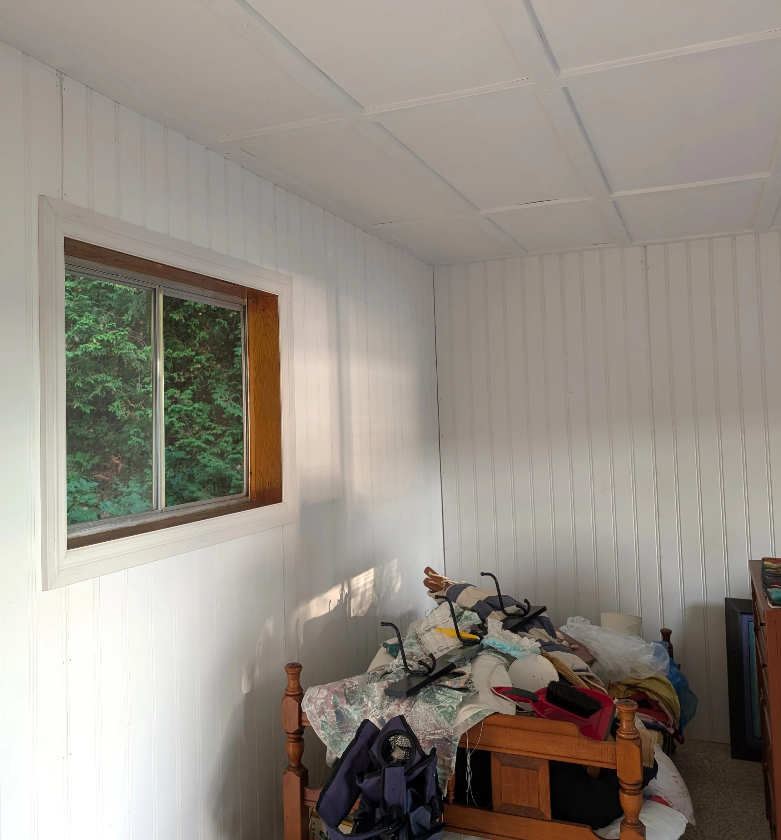 The biggest DIY project at the cottage this year is updating the sleeping cabin/bunkie. It’s been a bajillion years with just insulation and vapour barrier and no walls or proper ceiling, so we decided to finally do something about it. Hubby and I spent a couple of hours many days (that’s all we could manage because of the oppressive heat and humidity this summer) cutting and installing ceiling panels, strapping and panelling. I still have to do a second coat of paint on the ceiling and paint the paneling a soft grey. We then have to put down a low pile commercial style carpet and then do baseboards and corner molding. I’ll share the “after” when we’re done. Not too bad for a couple of people who have never done this type of thing before. And we’re still married!!!