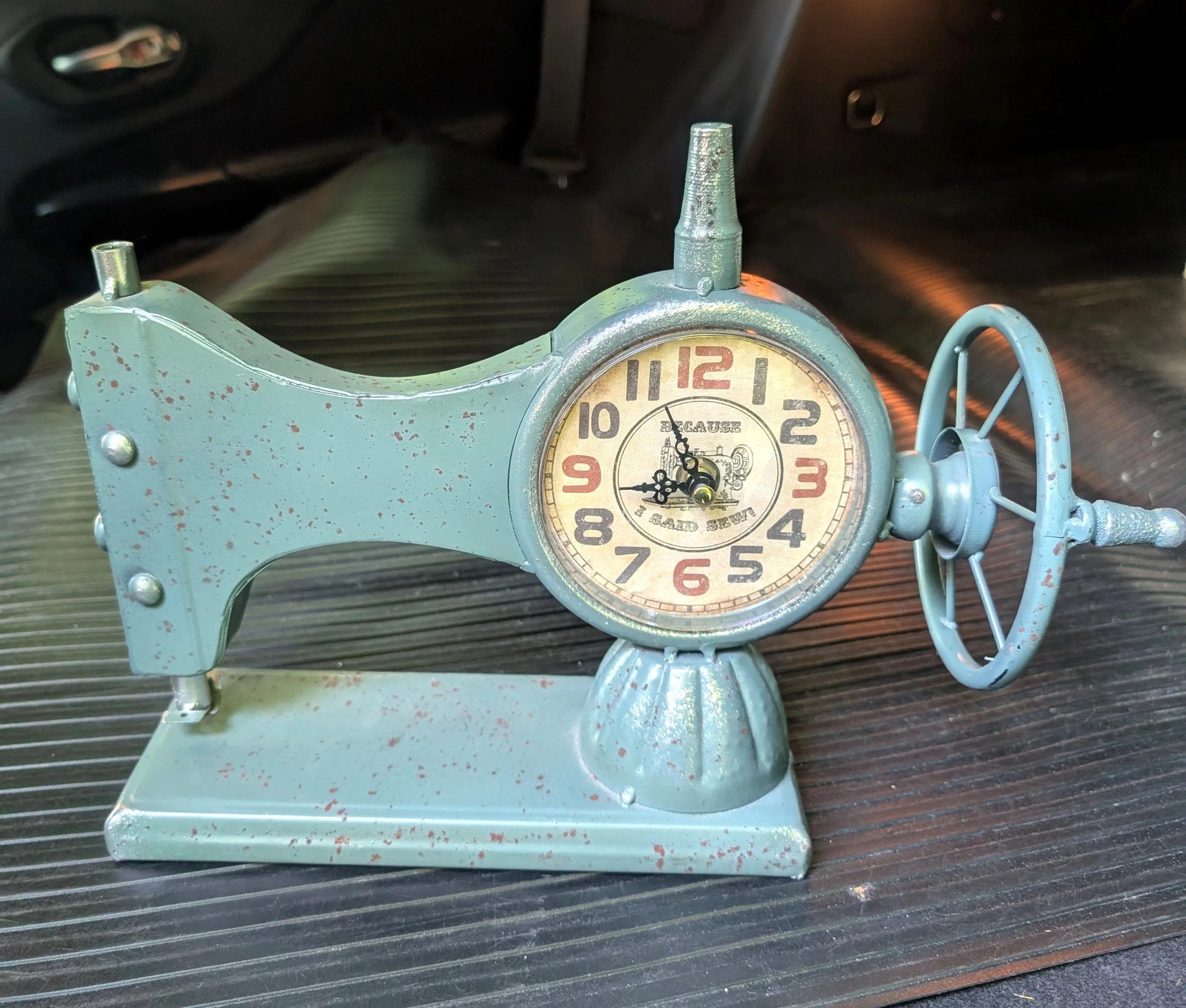 The cottage is 3 hours away so halfway there I usually stop in Belleville, Ontario, for a bathroom break and a trip to the Value Village there. You all know by now how much I love thrifting and theirs is a great location. Well, this trip I found this awesome sewing machine clock for only $6. What a deal! Around the clock face it says “Because I said sew”. So cute.
