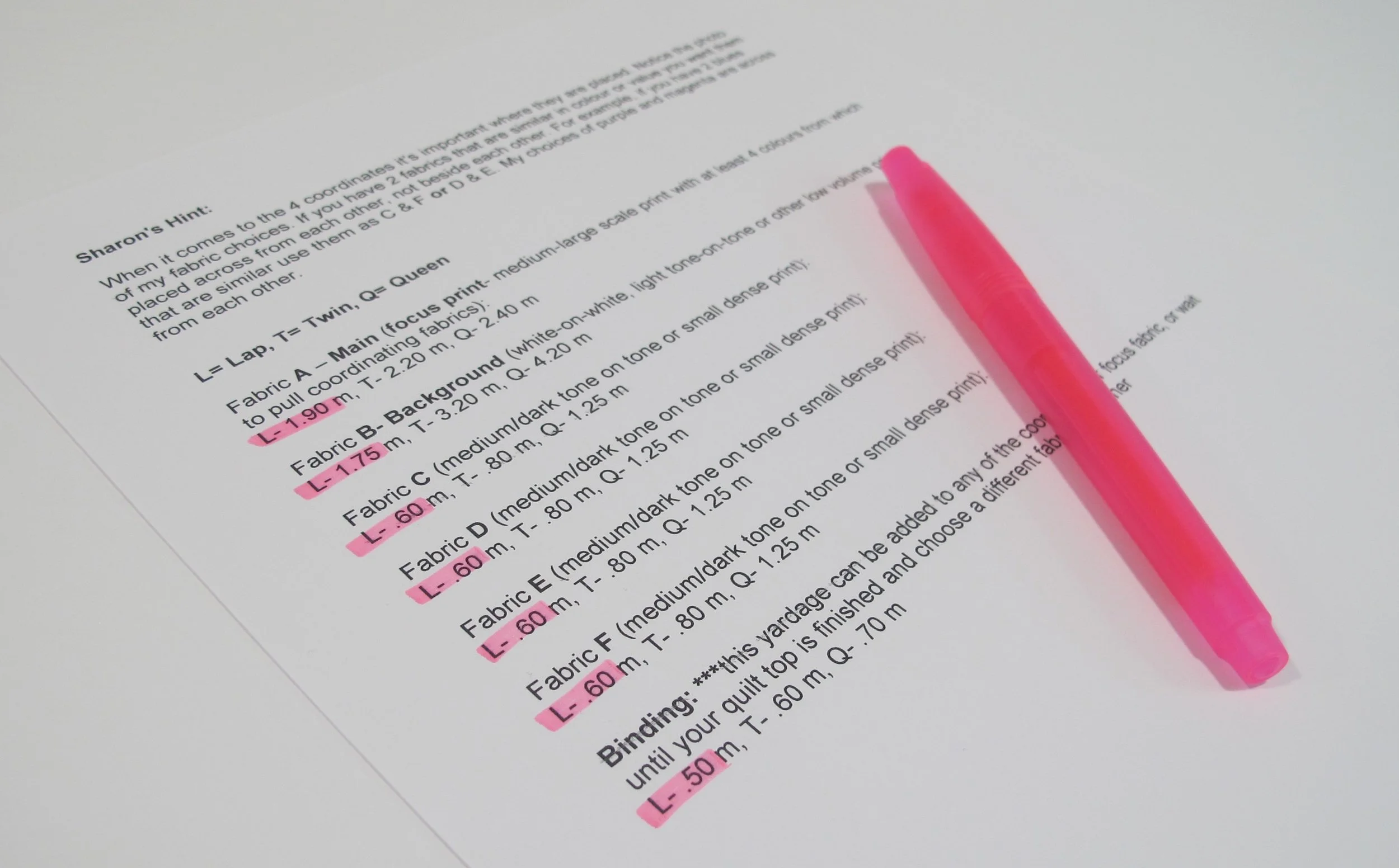 The highlighter marker will be used right away. Whatever size you are making, highlight the yardage for that size. I'm making the lap size so you can see the highlighted spots on my page.