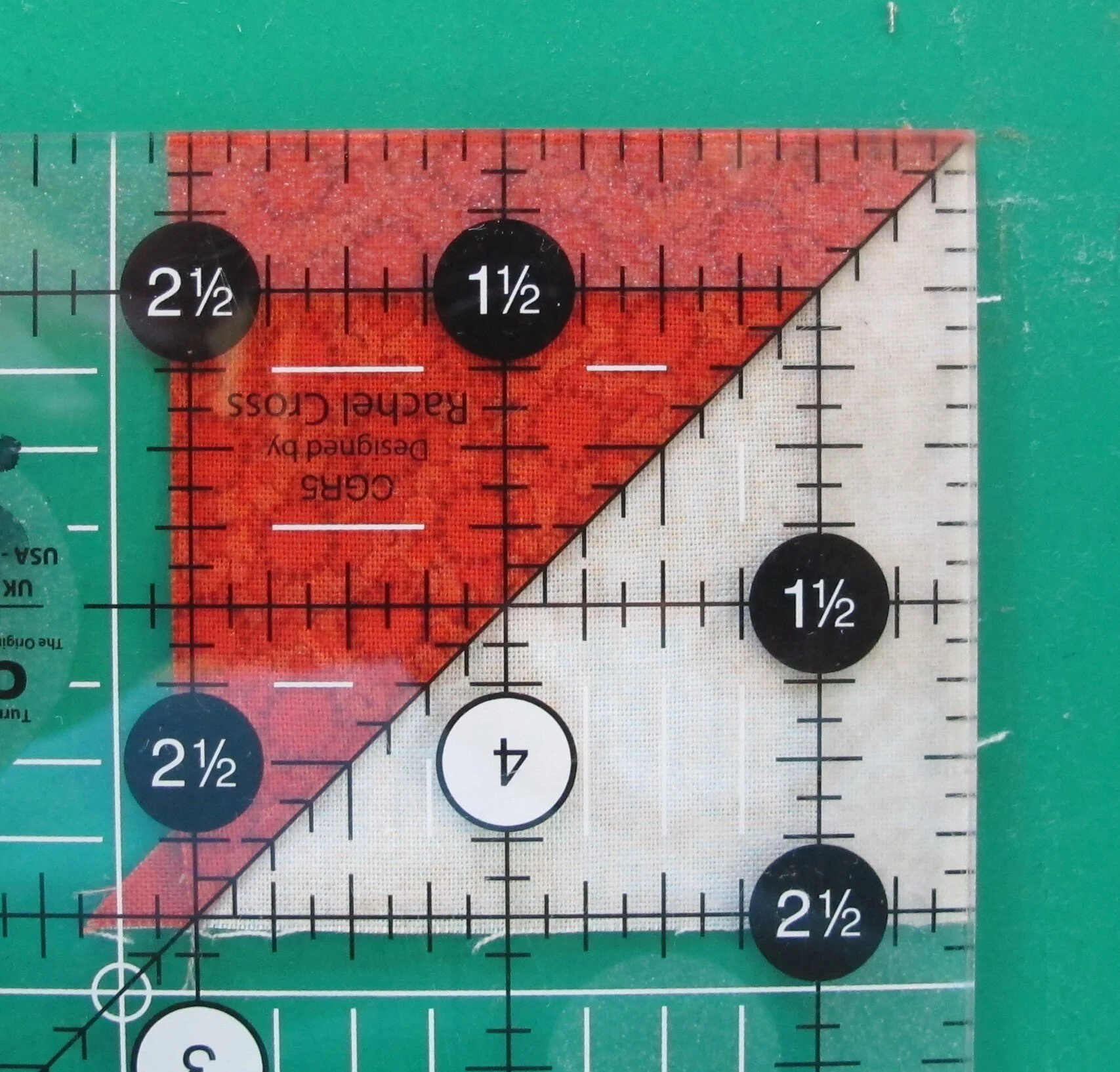 turn the HST around and place the 2 ½” markings from the ruler on the already trimmed corner and trim the final 2 sides (figures 4 & 5)...repeat with all HST's