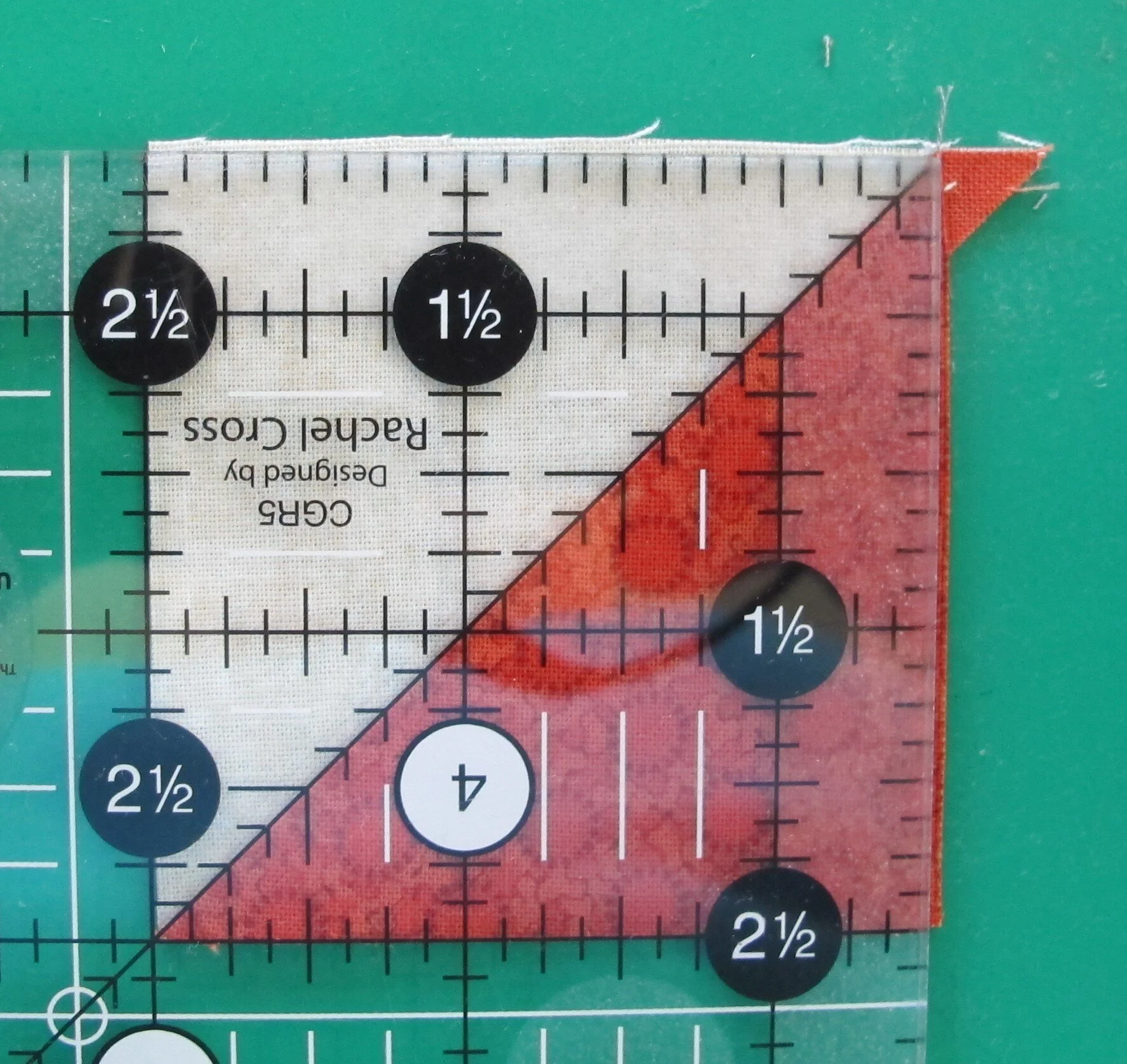 line up the diagonal line from the ruler on top of the seam line making sure that the entire 2 ½” area of the ruler is on top of the HST and trim the excess from the right and top of the square (figures 2 & 3)