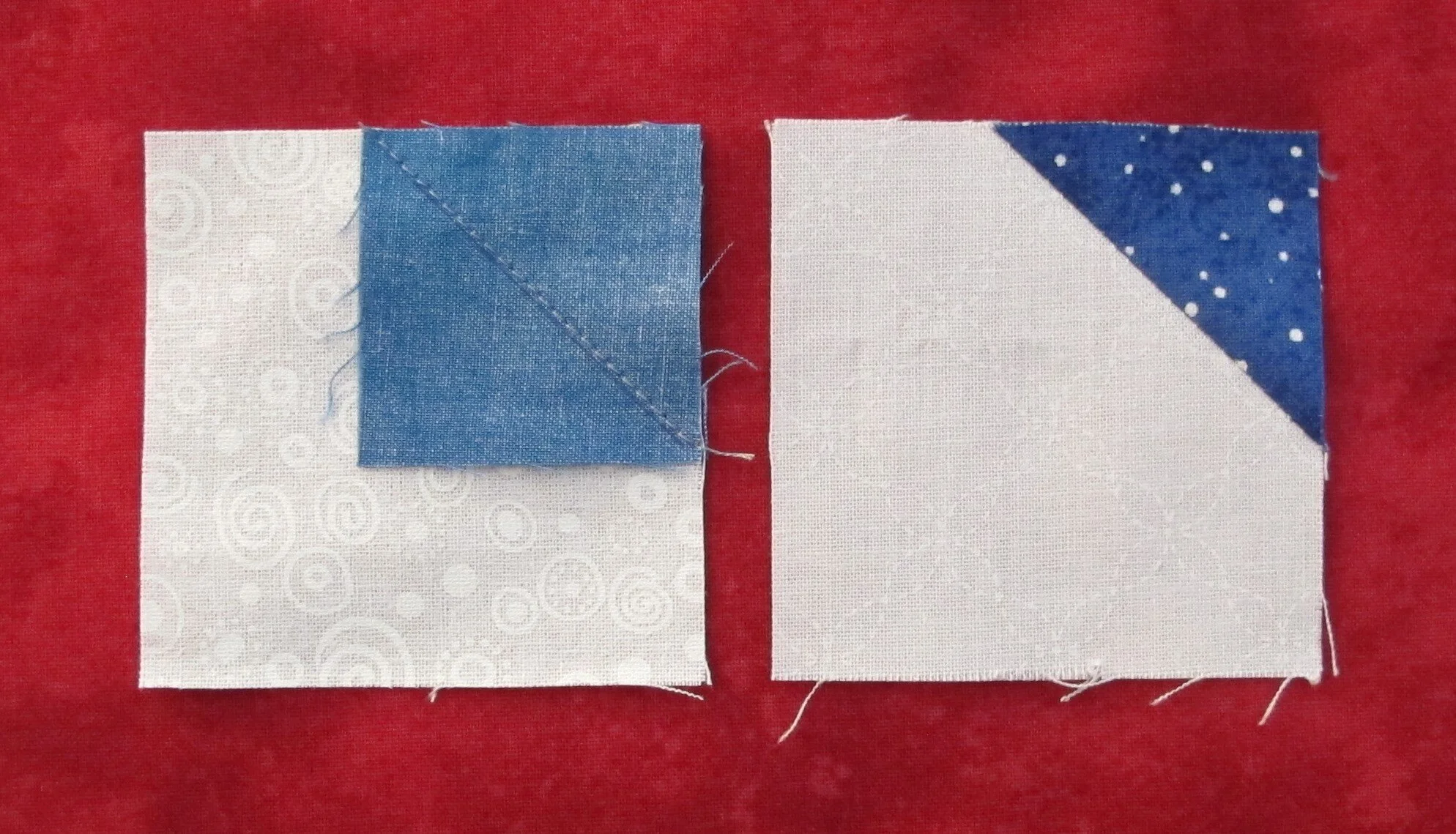 with right sides together place a blue square on one corner of a white square and stitch along the drawn line, repeat for the other 3 squares