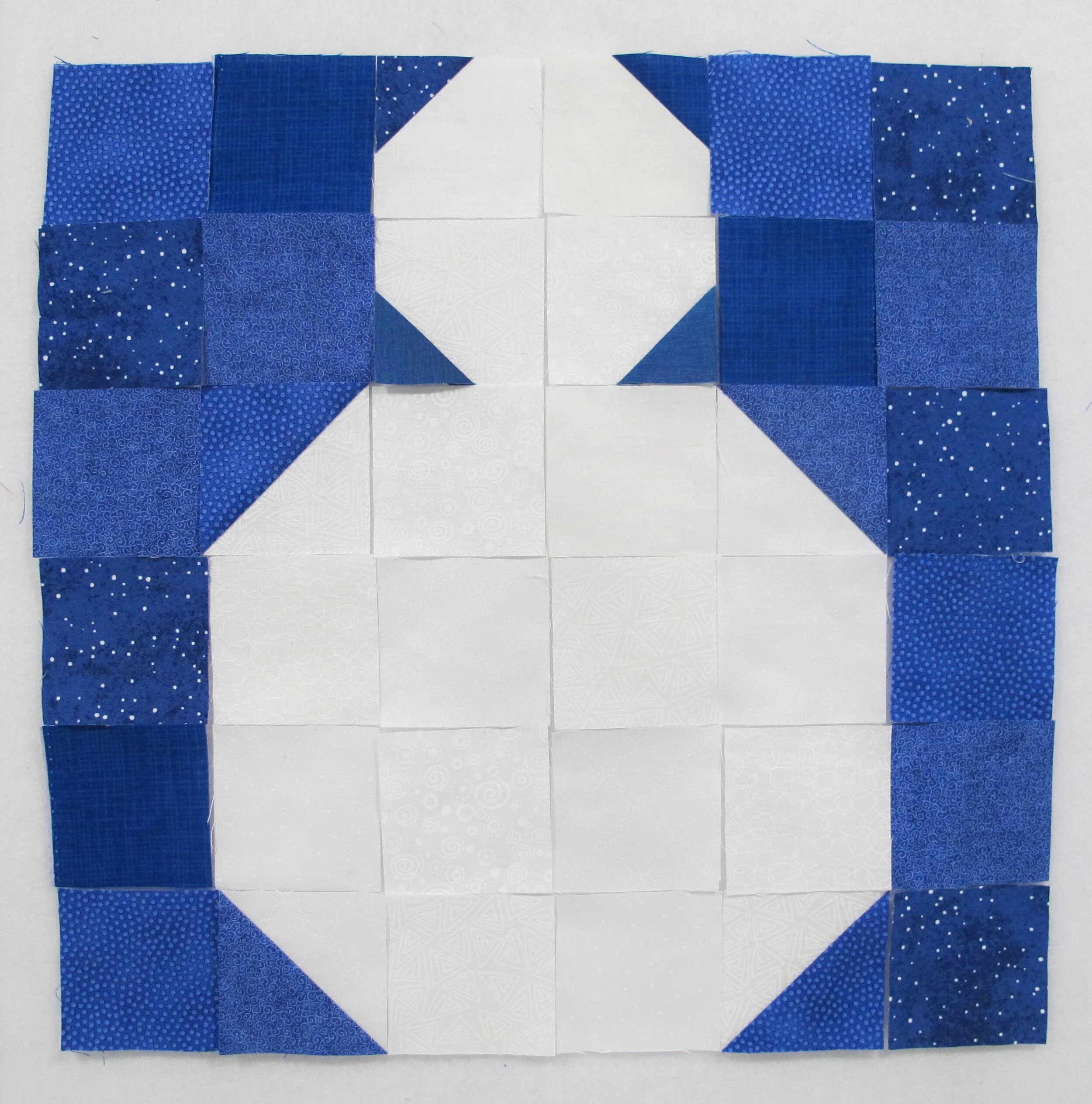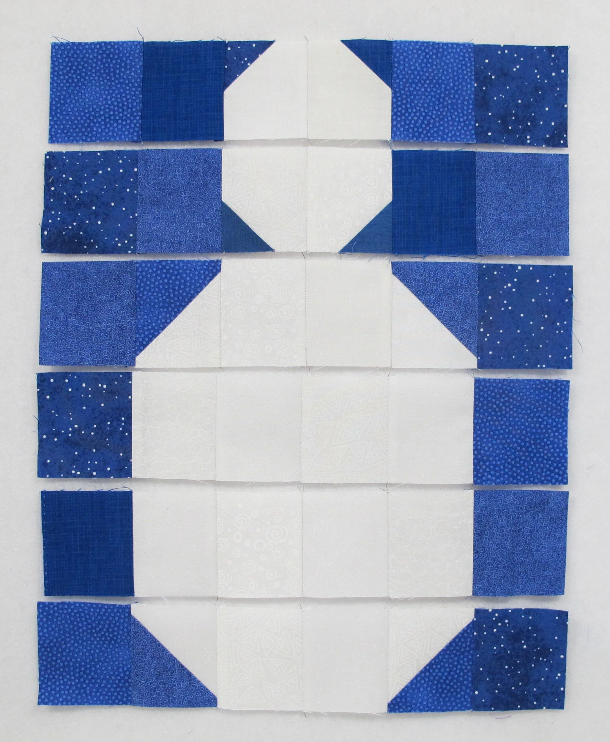 lay out the squares, snowman head pieces and HST's by following the photograph below for placement (figure 7)