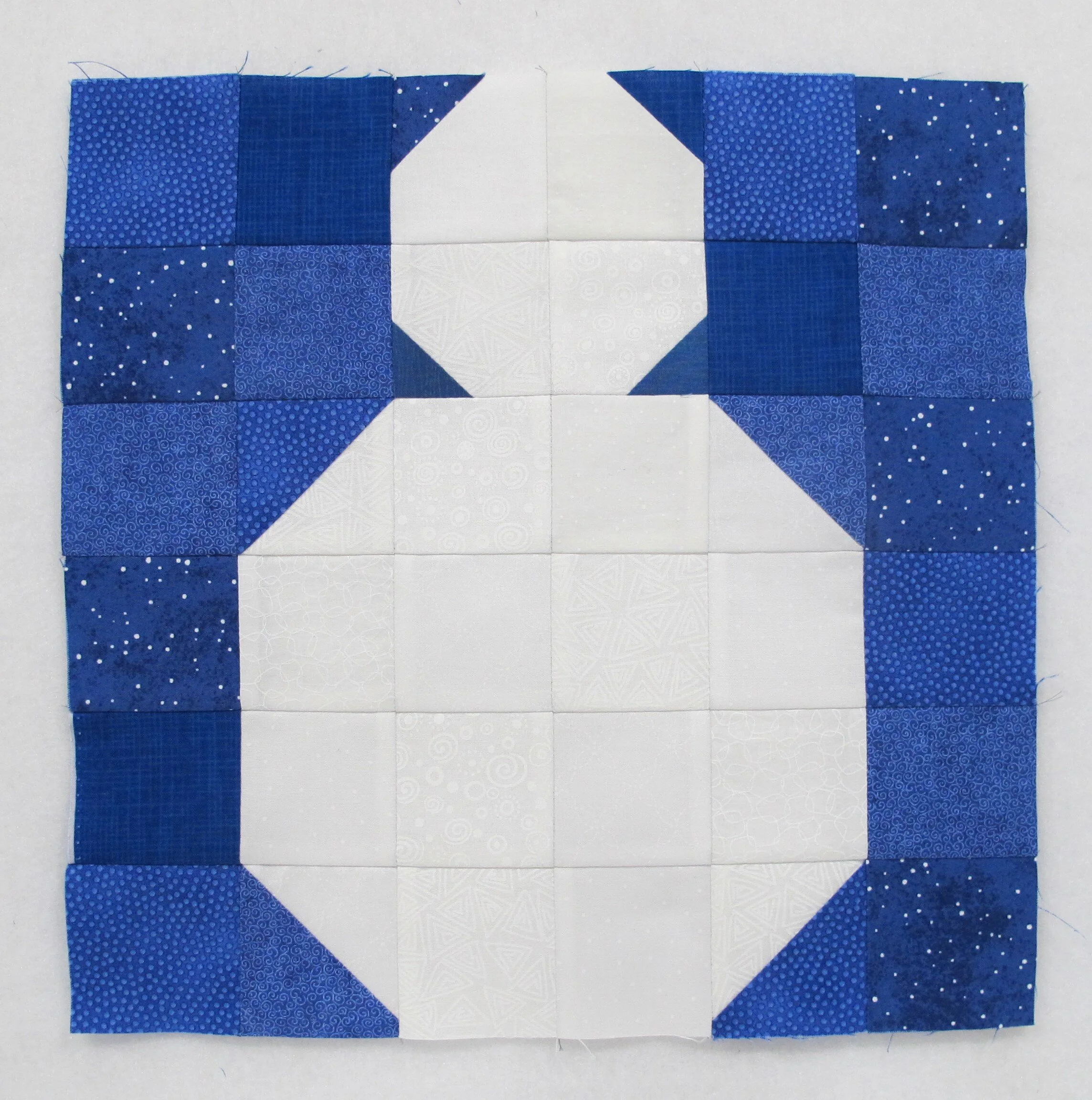 Snowman head: four 2 ½ white squares and four 1 ½” blue squares