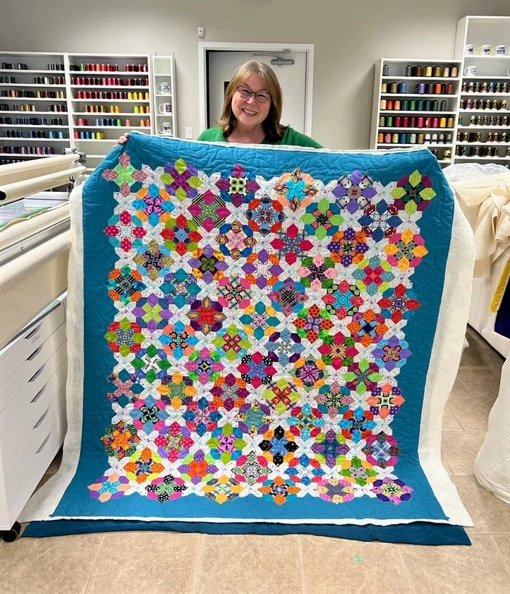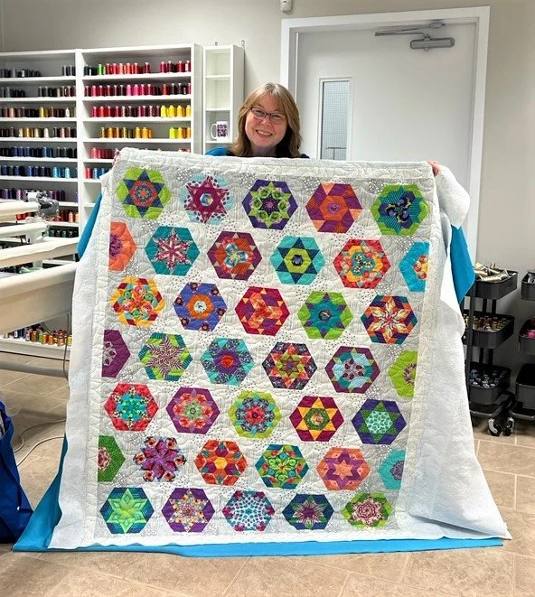 Our guild’s quilt show is coming up very soon…only 2 months away!…so I had to get my butt in gear and finish a couple of things. Not only did I want to finish my 2 English paper piecing (EPP) projects in time for the show, but I wanted to visit with my old coworker and friend, Tracey, of Whirls-n-Swirls Quilting. We worked together at Ultimate Sewing Centre for about 8 or 9 years and, even though we were hard workers, we always had so much fun at work…you know, acting like 12 year olds laughing at the same stupid jokes and dancing and singing along to great rock songs on the radio.