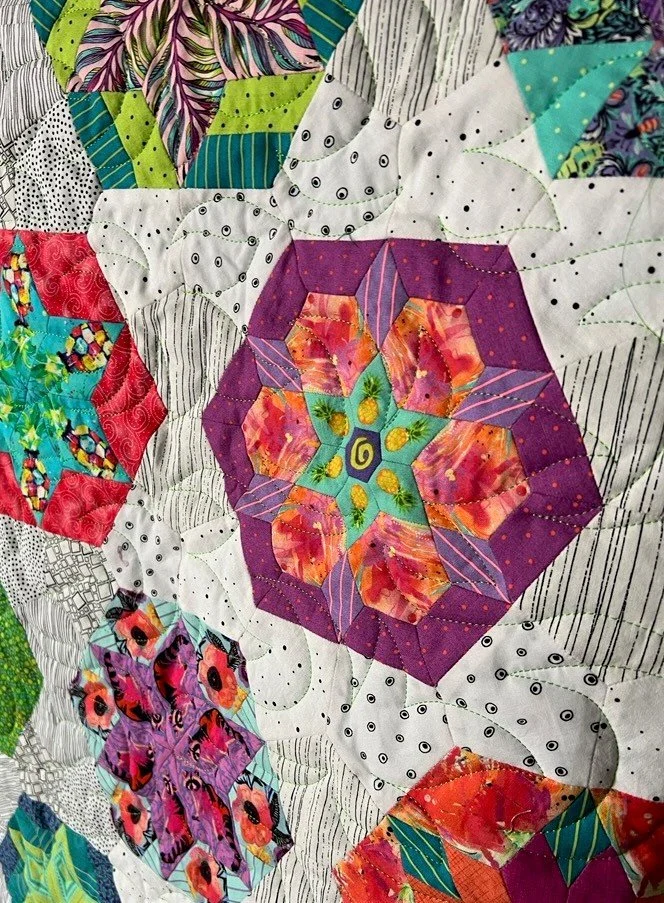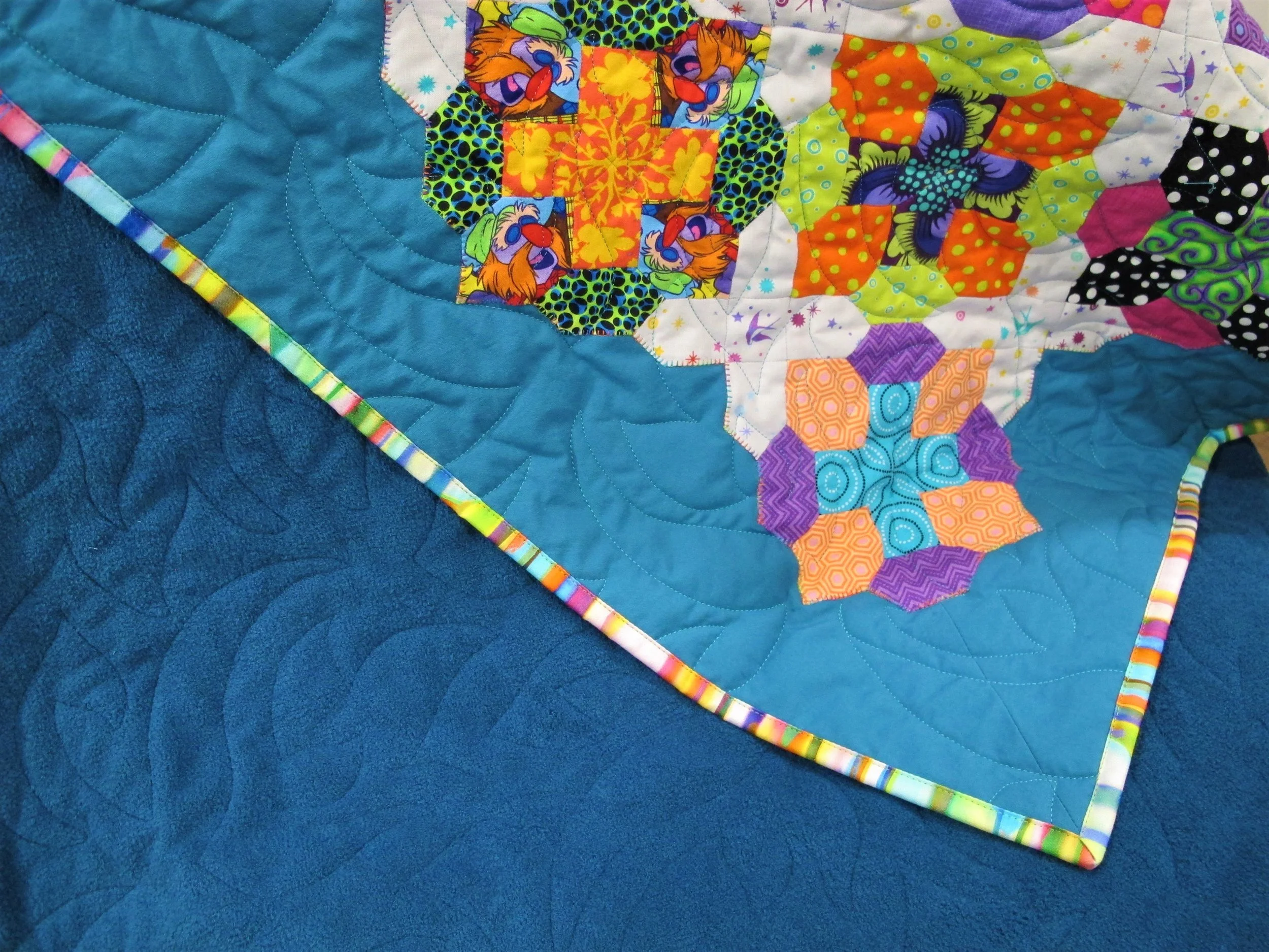 First up is Prudence by Lilabelle Lane Creations…this is the quilt that started my EPP obsession. I had an amazing time fussy-cutting the fabrics and working with unusual colour combinations. I knew that this would be MY quilt so I backed it in cozy Cuddletex in a beautiful deep teal colour because I want it to be my movie watching/reading/hand sewing quilt. I used the Caliente pantograph by Urban Elementz, Glide thread #67472 Sea Green for quilting and finished it off with a cool stripy binding. I’m so happy with how it turned out.