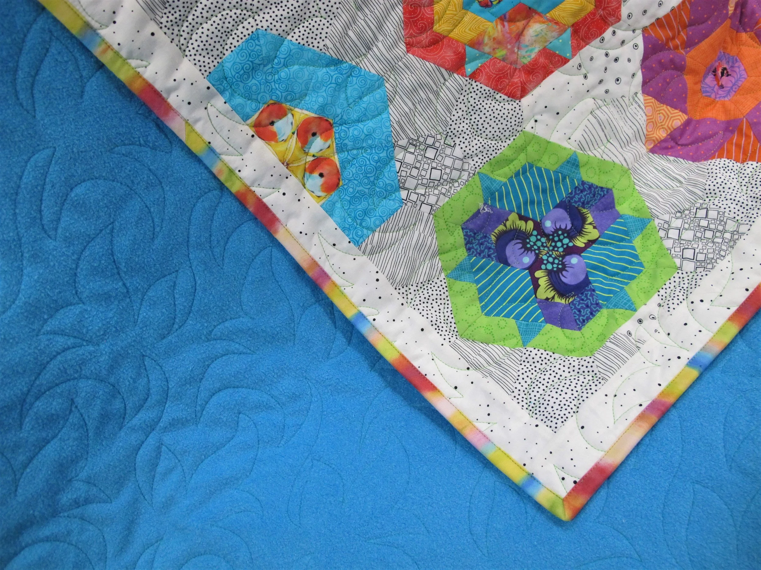 The second EPP project completed is Southern Aurora, also by Lilabelle Lane Creations. I have to admit that I didn’t really like the photo of the quilt on the pattern cover…I thought it looked too “blotchy”…so I tweaked it to highlight the blocks better. The white/black mini prints really allow the blocks to stand out. Again, lots of fun fussy-cutting and making up great colour combinations. If you want to see the individual blocks check here, here, and here. This time the backing was Fireside (similar to Cuddletex, but not as wide) in a great turquoise colour with Glide thread #60376 Kryptonite and the Zest pantograph by Urban Elementz. I guess you can tell that I’m partial to striped bindings!