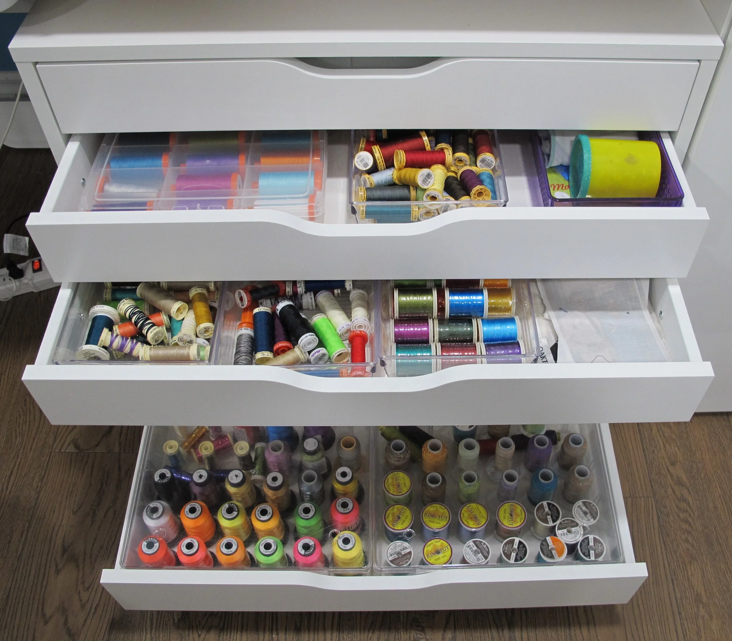 Throw out the really cheap, bad quality thread you bought when you were starting out and didn't know better, keep the stuff you love and use, and donate the thread that's still good quality, but stuff you know you won't use...a new quilter will be thrilled to get your donations, or take it to your quilt guild to share the wealth. Once you have your final “keep” choices made then you can decide how to organize them…get containers specifically for thread, use bins in a drawer, or whatever system works for your brain.