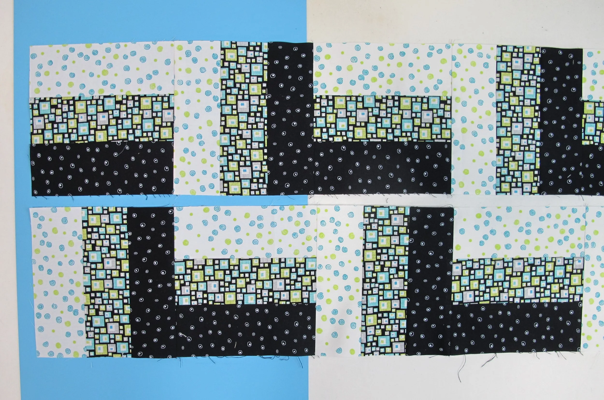 Row 2 has the light strip on the left where the first block on the left is positioned and the block next to it has the light strip on the top. Again, stitch five blocks together alternating the blocks as shown in the photos. Three of these rows are required. ***There will be one block left over. Figure 3 shows positioning of the blocks for both rows.
