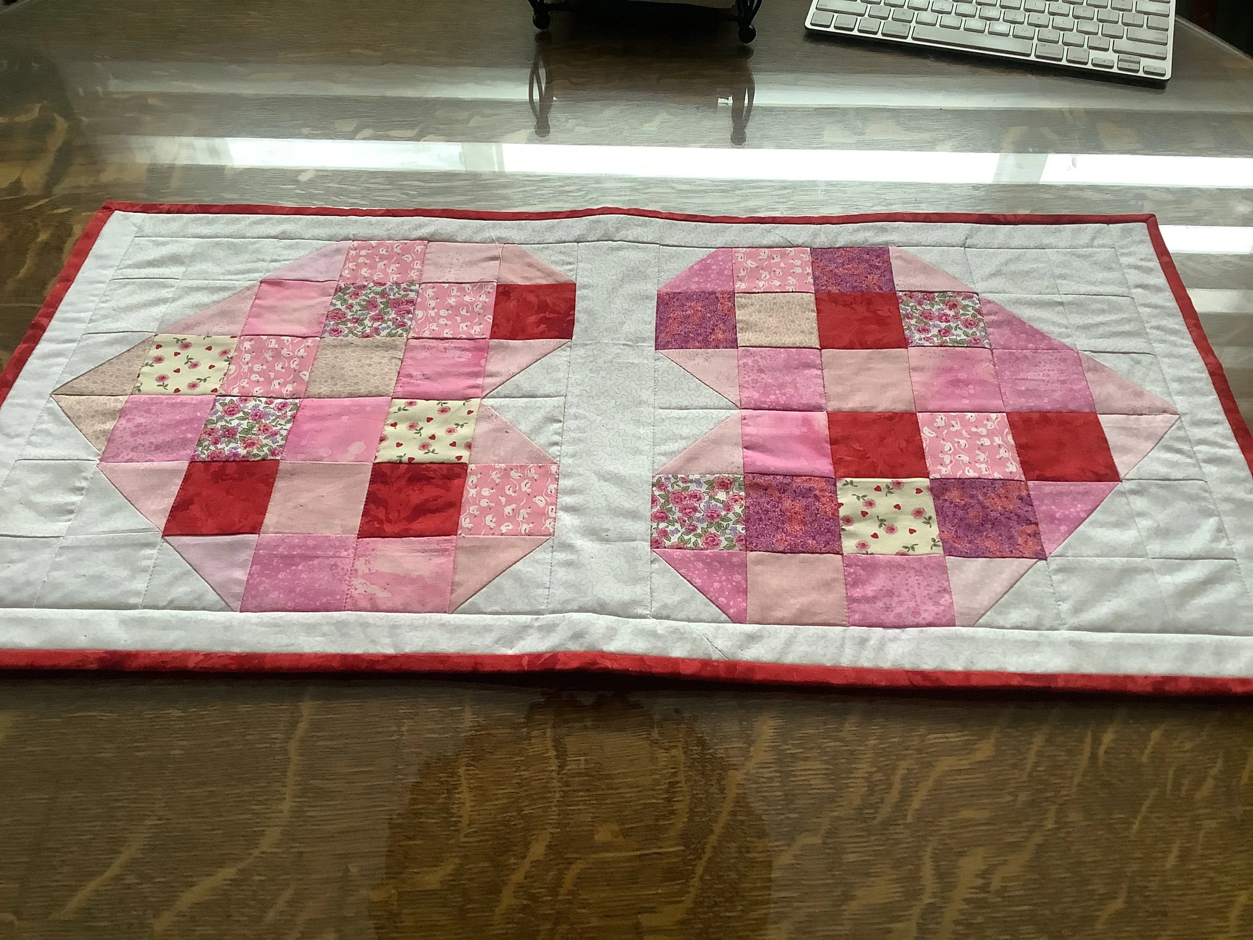 Barb M. from Oshawa, Ontario sent photos of her January Snowman and February Valentine Heart. Don’t you love the jaunty little top hat on the snowman? I also love that she made a table runner from 2 mirror image hearts.