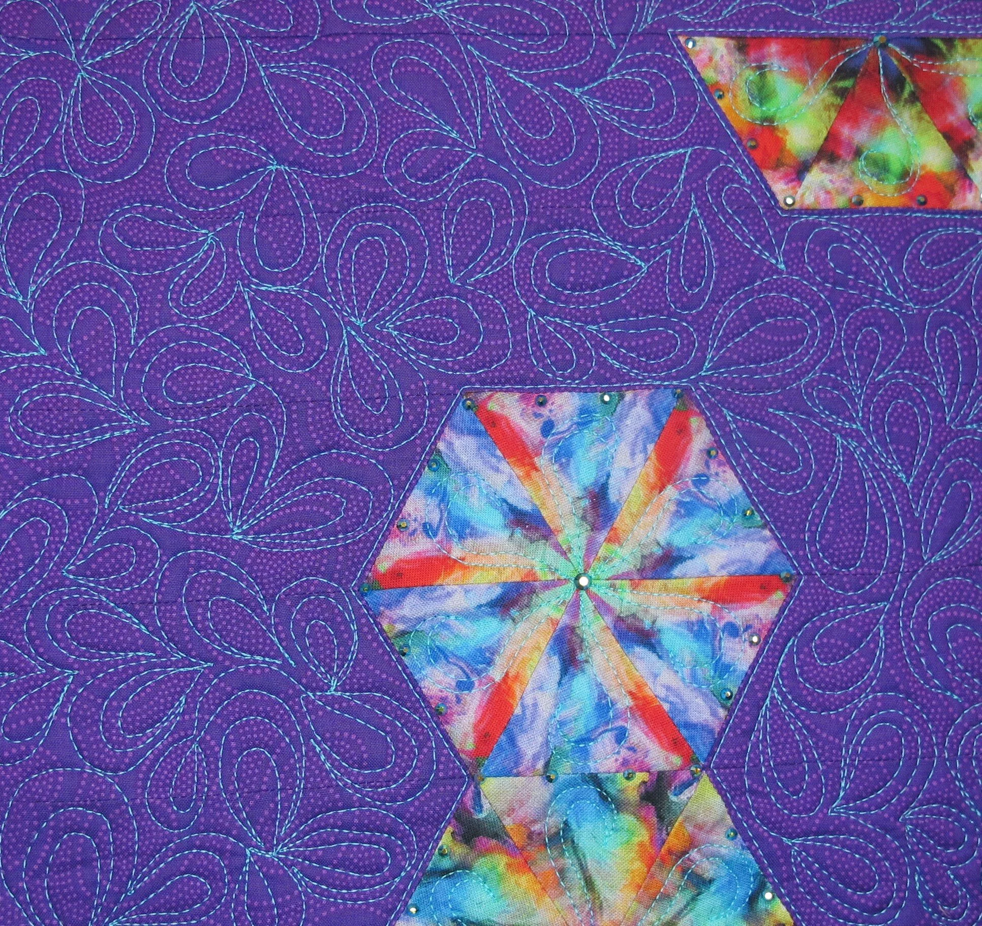For those of you who do quilting and machine embroidery you probably already have some really beautiful embroidery threads in your stash. Floriani has a gorgeous 100% polyester 40 wt embroidery thread that is colour fast and has an incredible sheen. I often use it to highlight quilting on wallhangings or decorative pieces for a little more oomph. The sample shown below uses turquoise PF376 on a purple print fabric.