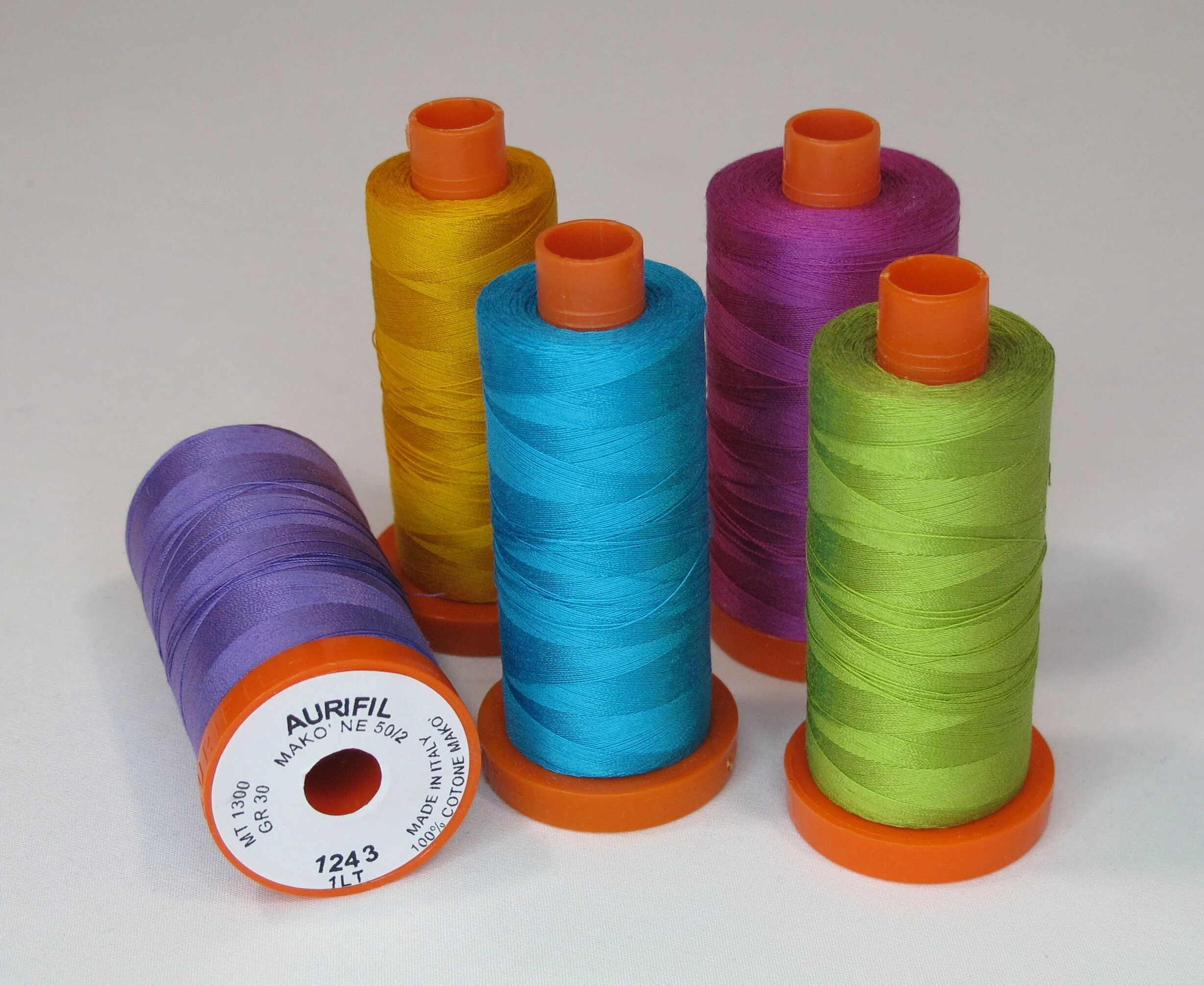 Thread comes in different weights and the weight you choose depends on how you plan to use it. The main thing you need to remember about thread weight is that the higher the number the thinner the thread. Thread weight is not always clearly marked on the spool. Take a look at the photo of Aurifil thread again. Under the Aurifil name you will see the numbers 50/2...the first number is the thread weight and the second number shows thread ply (or how many strands are put together), so this is a 50 weight thread with 2 plies. (purple #1243, yellow/orange #2145, turquoise #2810, fuchsia #2535, green #1147)