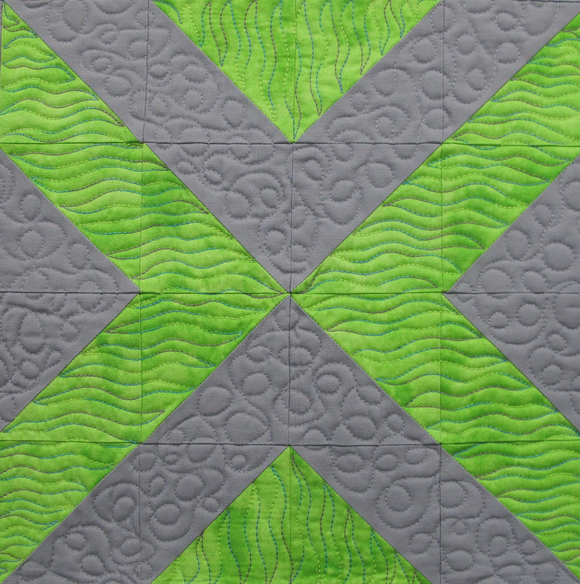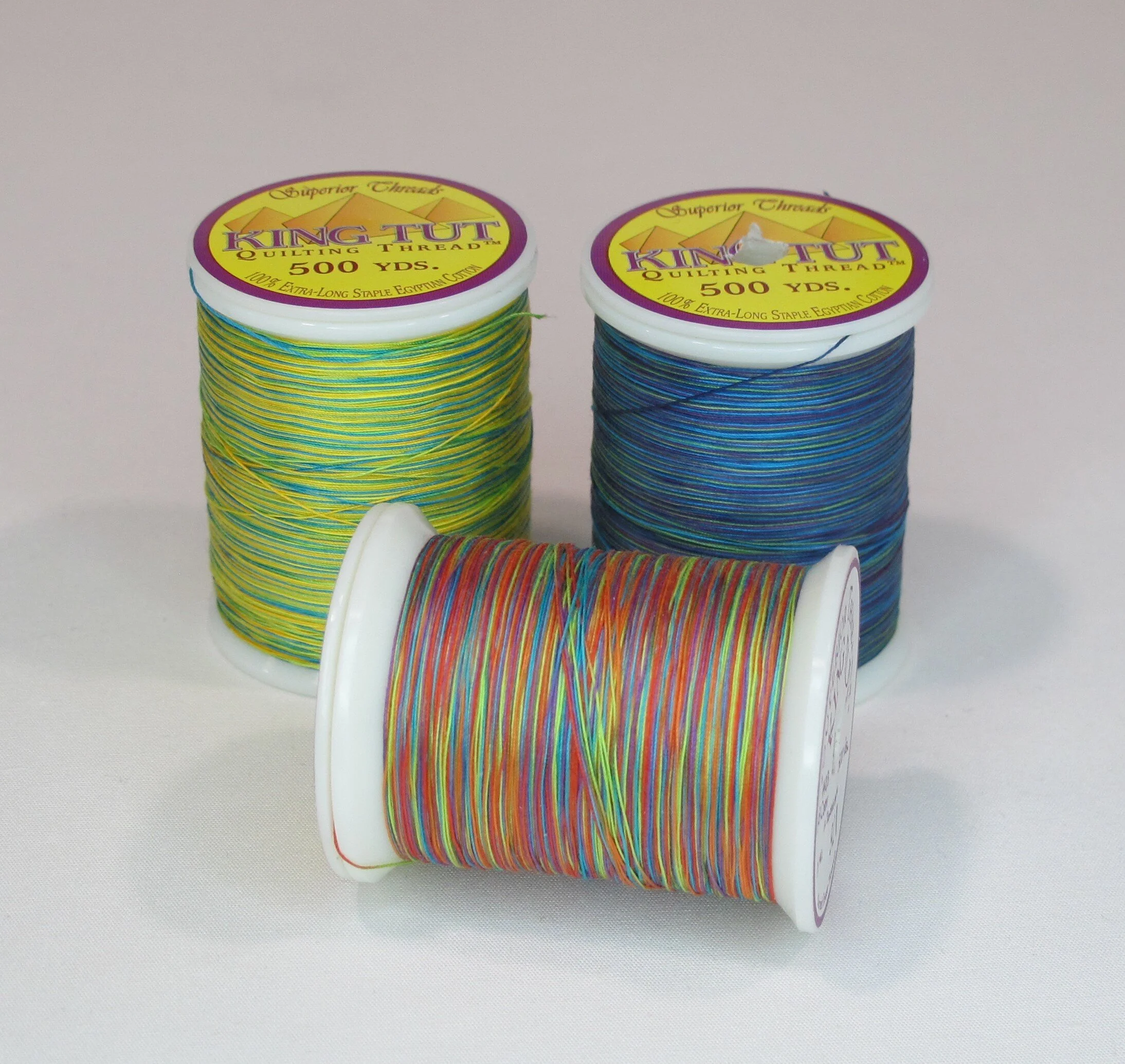 King Tut variegated is a low lint 40 wt thread with 1” colour changes. My favourite one is called Cleopatra (#921) and I also use Nile Delta (#934), Arabian Nights (#935) and Cairo (#932) quite often, but they have so many other amazing colour combinations to choose from that it's hard to pick a favourite. The sample block below shows King Tut Cairo on the lime fabric and Aurifil on the grey.
