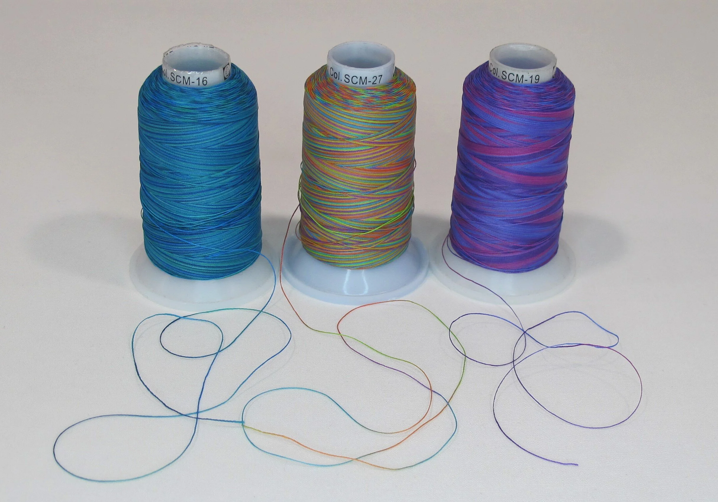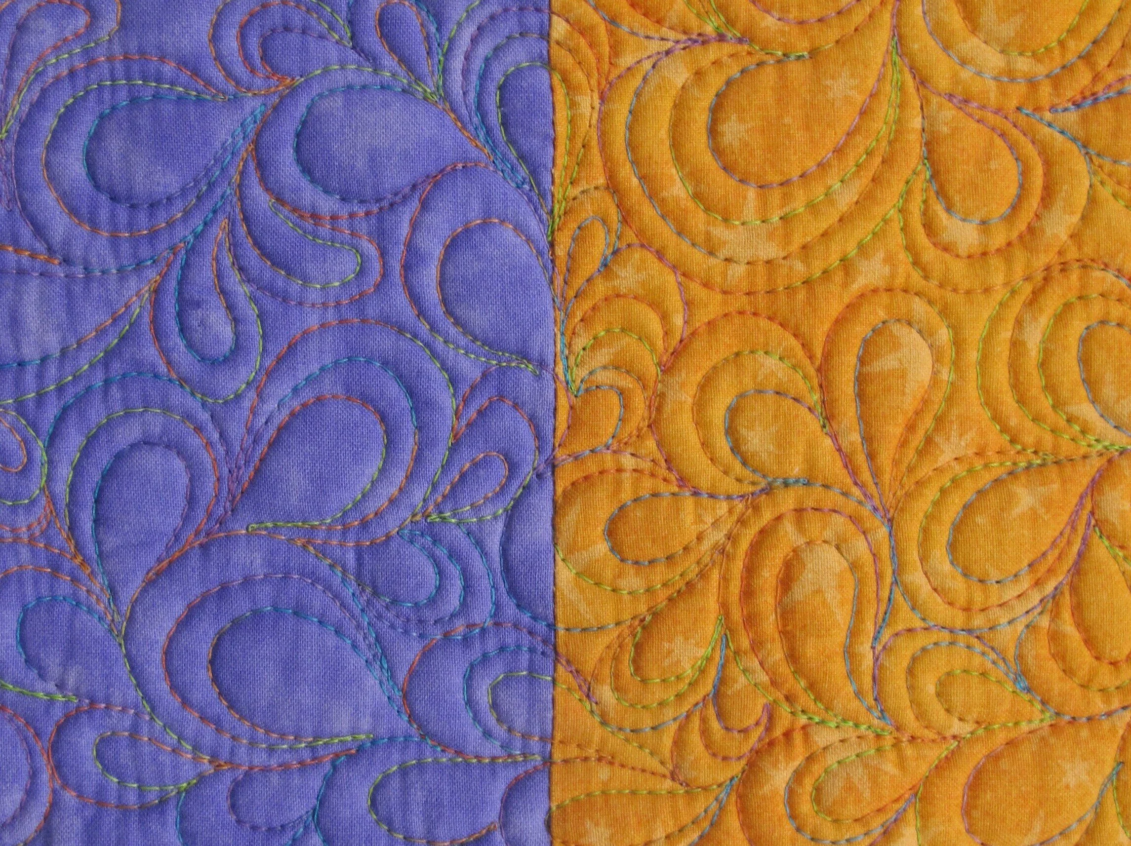 Silco Sunset SCM-27, my all-time favourite variegated, is a lint-free 35 wt thread that can be a little troublesome to use because it gets “spinny” when you feed it improperly on your machine and can cause thread breakage. The thread should not be fed off the top of the spool unless a thread net is used. It's better coming off the side of the spool instead. Below you can see that it highlights the fabric beautifully and really shows off the free-motion stitches.