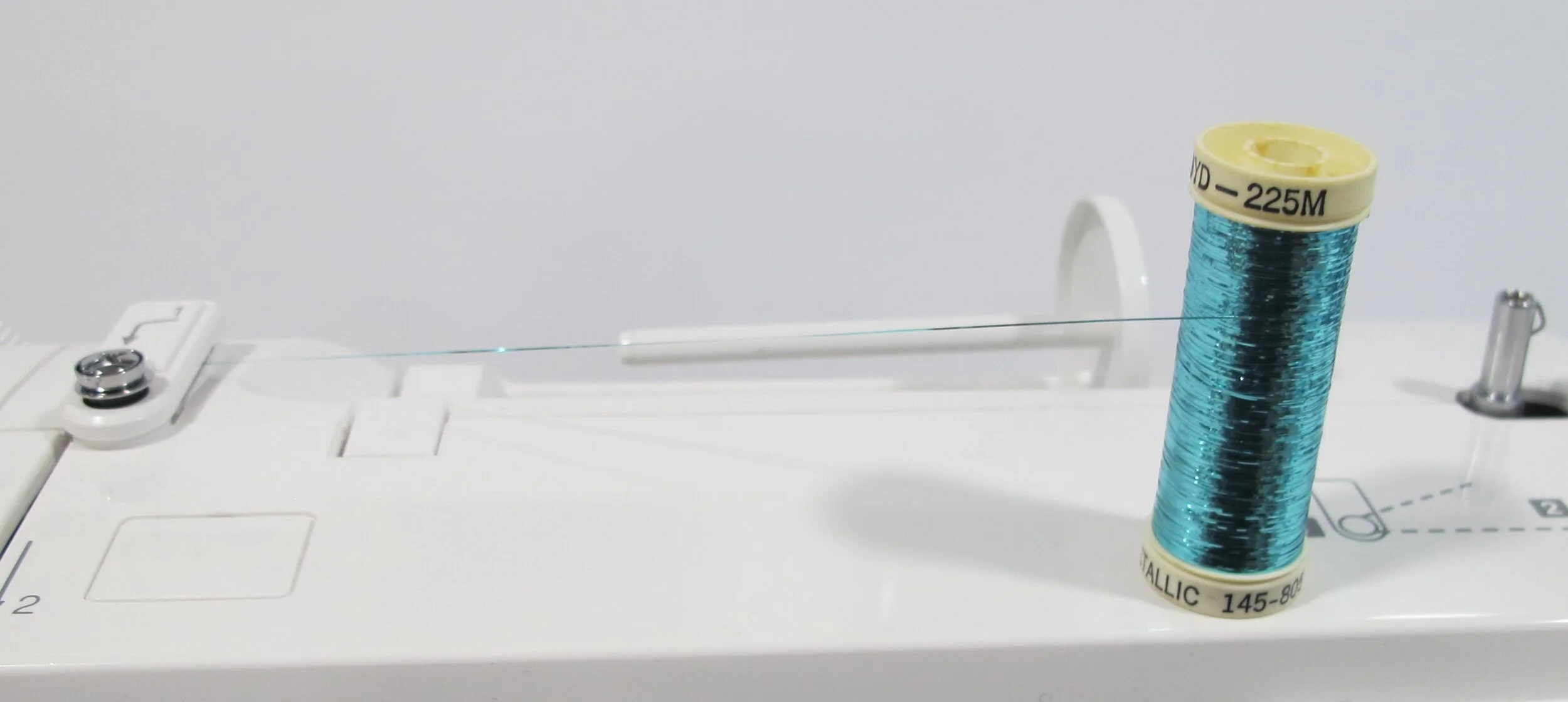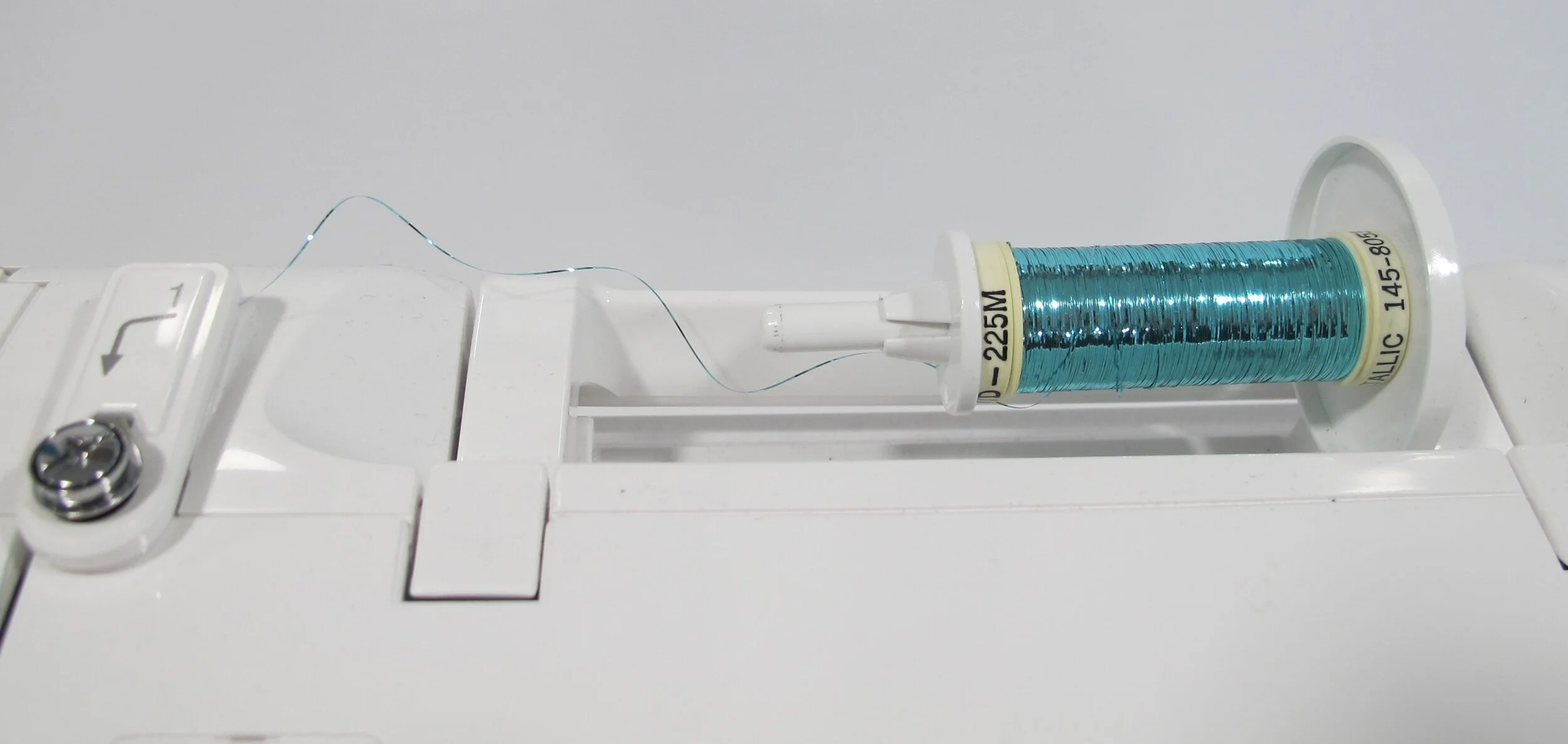 The trick to working successfully with pesky threads is to get the thread to feed off the side of the spool. Some of the smaller machines have a hole at the top of the machine where a vertical spool pin can be inserted. This allows the thread to be fed off the side of the spool.
