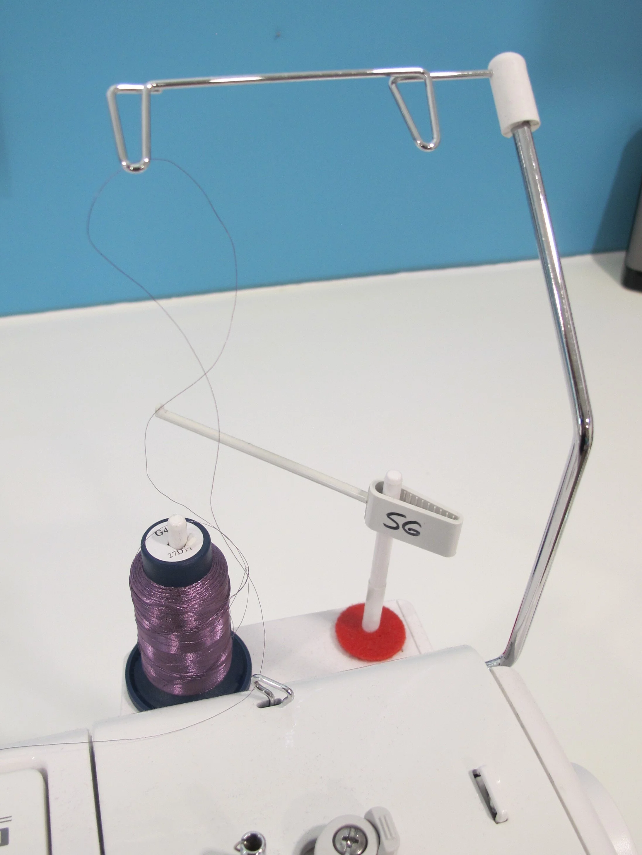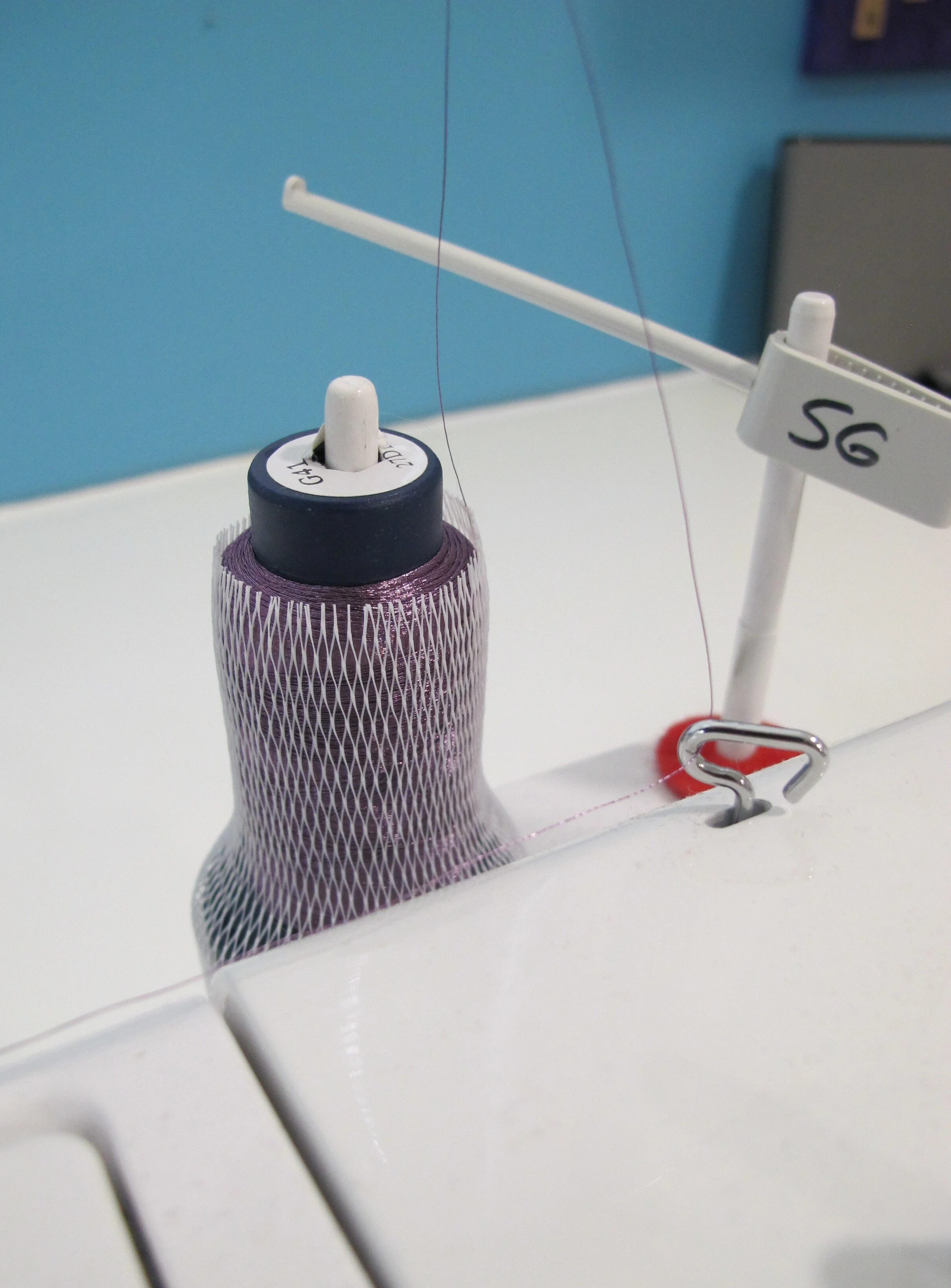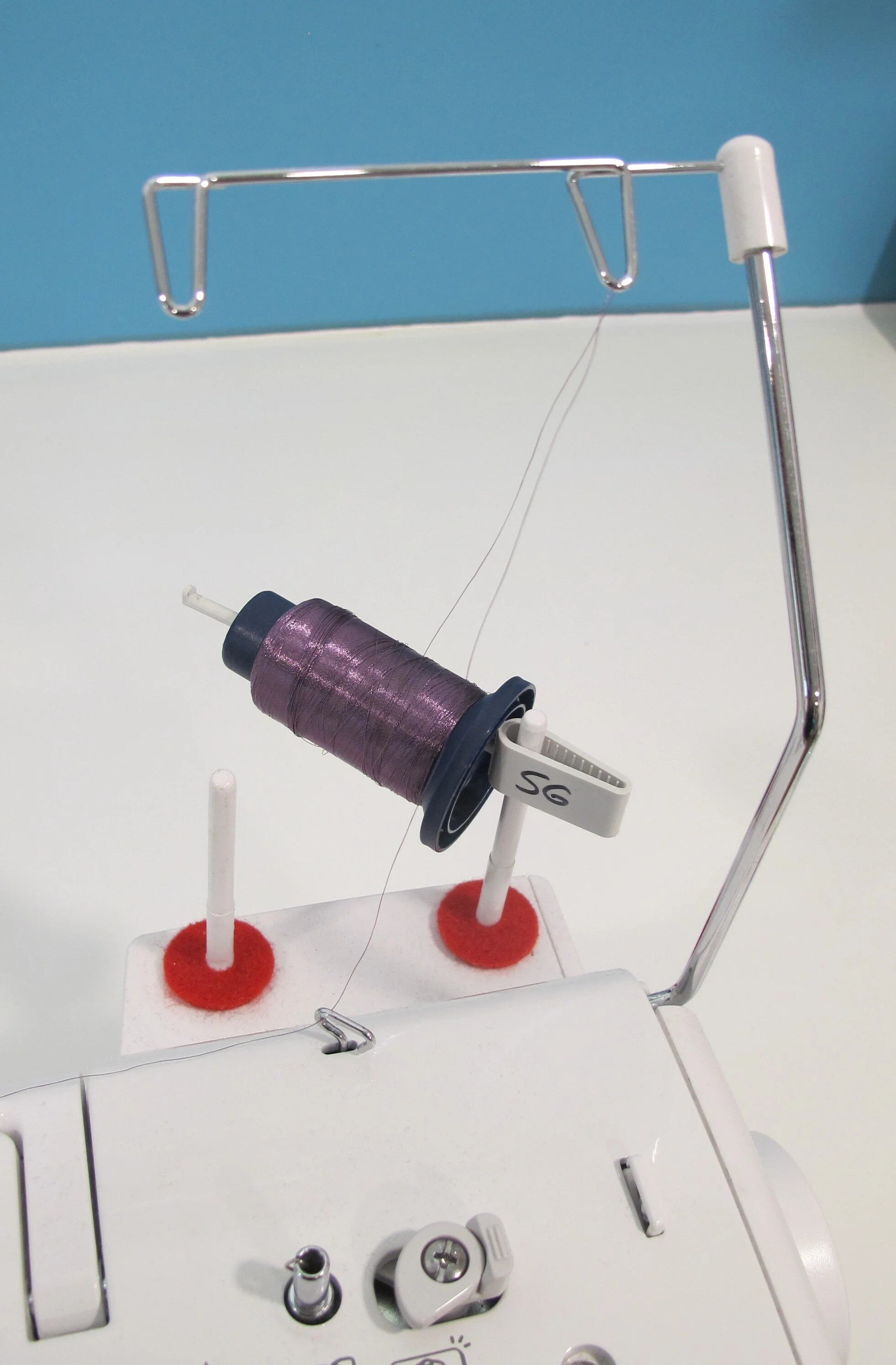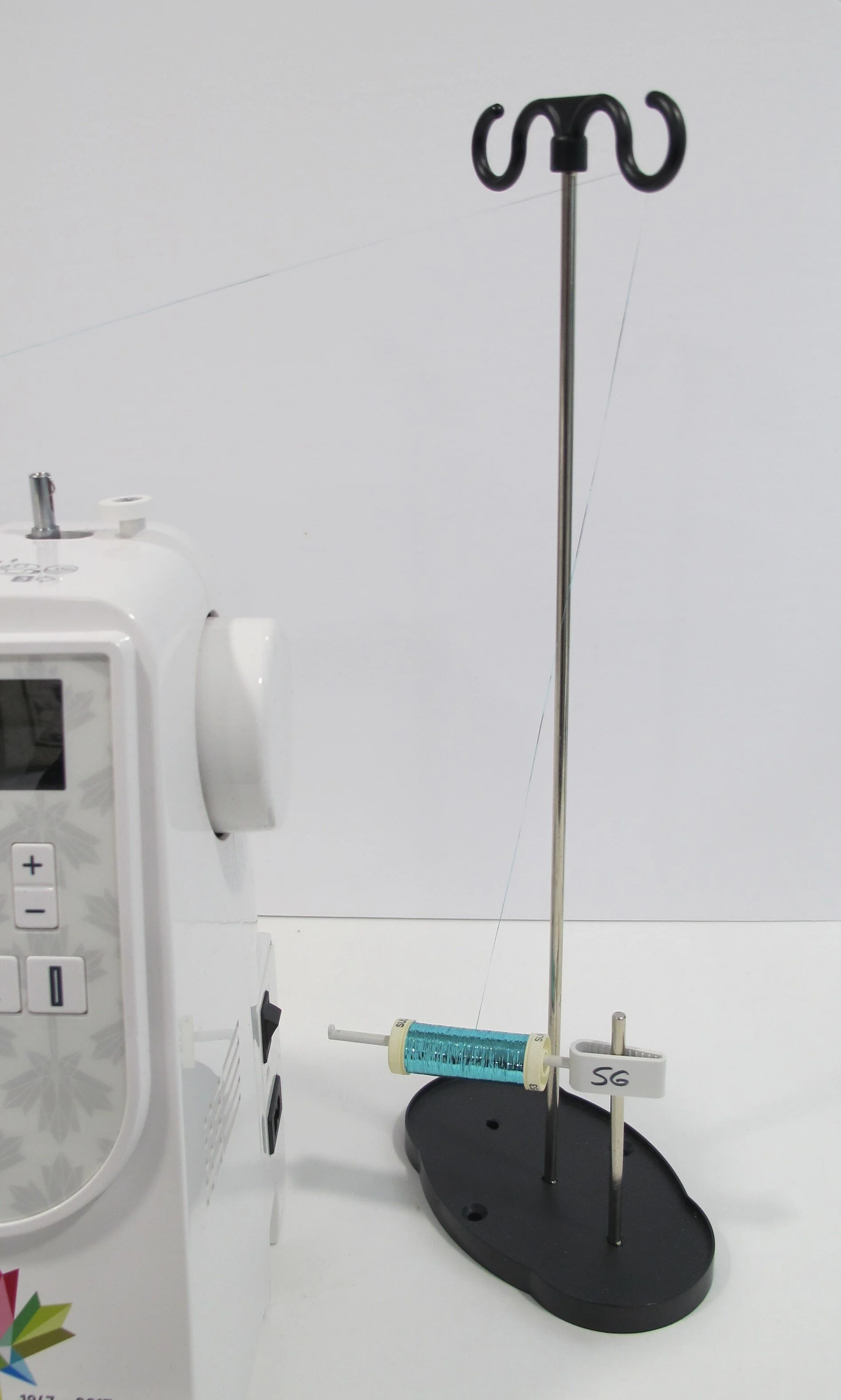 If your machine does not have a spot for a vertical spool pin there are inexpensive stand-style thread holders that you can purchase (inexpensive thread stand here). If you do get one of these you'll still need an adaptor like the one in the photo to allow the thread to feed properly (mine is from Janome)...or you can “MacGyver” one to the top of your machine with Velcro or glue...or you can spend more money to get the fancy thread stand that offers both thread path options (fancy thread stand here). My Janome 6700 already has the vertical spool pins at the back so I just needed the adaptor for my machine.